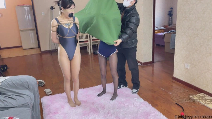 两女被歹徒换上死库水,绑成海老缚,带上口球,不住的流口水,歹徒玩弄了一会,将二女装袋卖走。