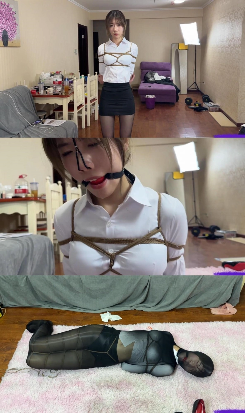 高颜值女神、黑丝白领,开腿捆绑放置、口水直流、鼻钩、丝袜套头、丝袜全包美颜破坏~~高冷美女反差变~~