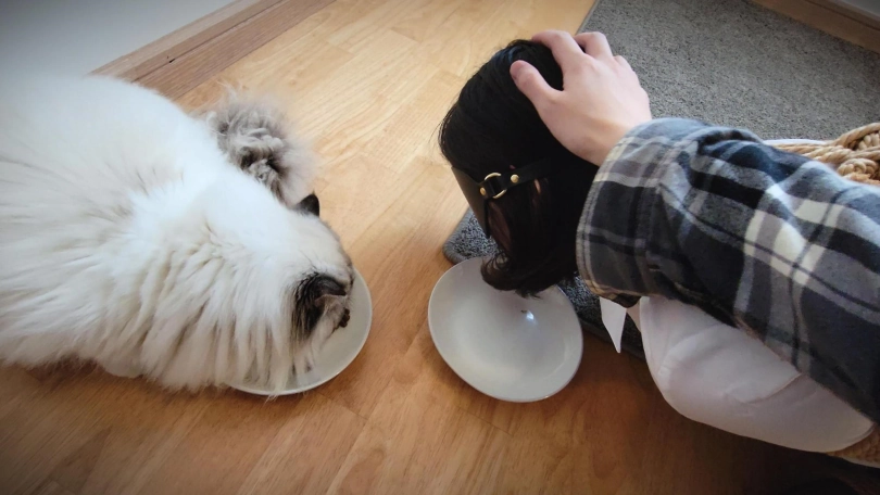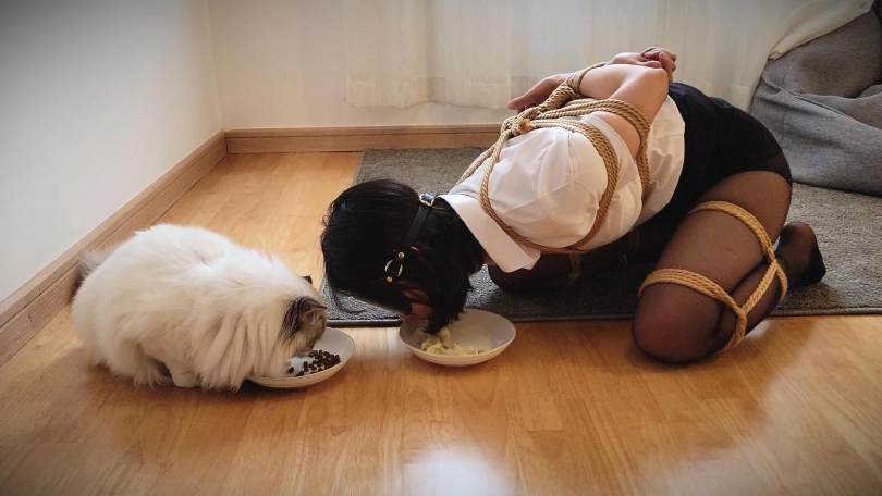 剧烈挣扎,叫声诱人,被脚踢打pp,趴在地上和猫猫一起吃饭,摸摸头,被猫咬了,听话了就棒棒奖励,越来越乖了…