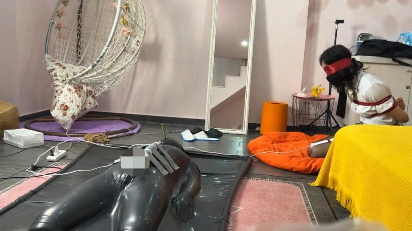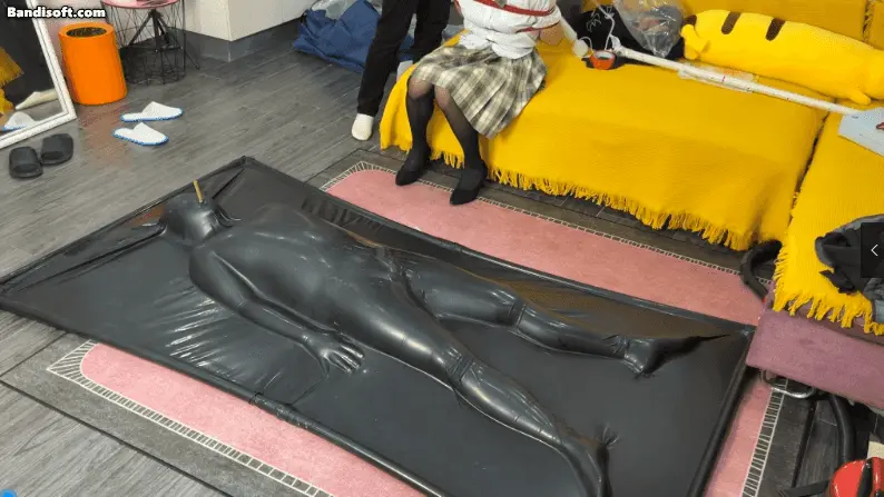 这一次的黑魔法师抓住了一对夫妻,被黑魔法师抓住以后,黑魔法师把丈夫关进了乳胶真空床里,妻子被绑在一边看着关在乳胶真空床里面的丈夫。黑魔法师首先用[X_X]放在丈夫的双腿之间,隔着乳胶刺激丈夫的私密部位,被调教的丈夫在里面来回挣扎,妻子只能在旁边无助地看着。然后黑魔法师用绷带蒙住妻子的眼睛,强迫妻子跪在地上,接着岔开双腿,被黑魔法师固定了[X_X]在双腿之间,也开始用[X_X]刺激。两人都被黑魔法师束缚在原地,无法逃脱只能在房间里面接受黑魔法师的不断调教。