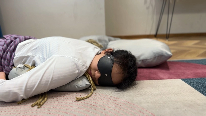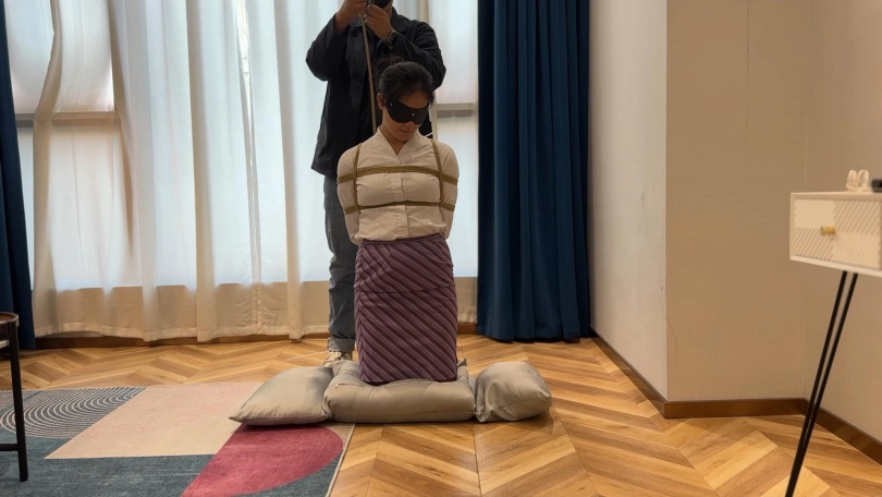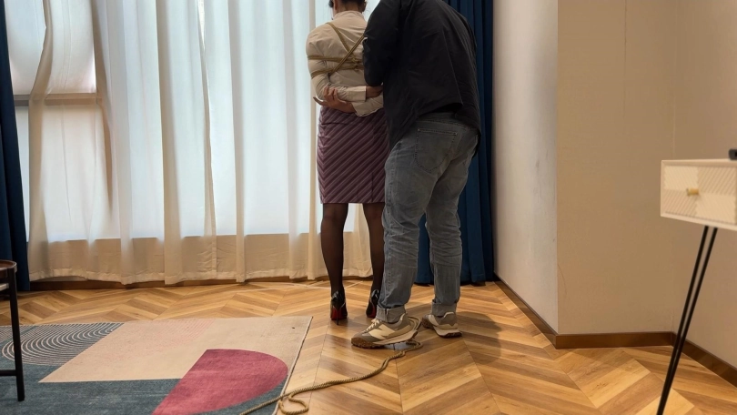 试完扎带,洋洋说那个叫丢雷的大神好像绳子绑的也还不错,叫我试试他的绑法,于是我只好认真学习了大神的作品,结果眼镜会了手没会,事实证明洋总高估了自己,最终坚持不住了,视频最后留了一个小彩蛋,女模特候场