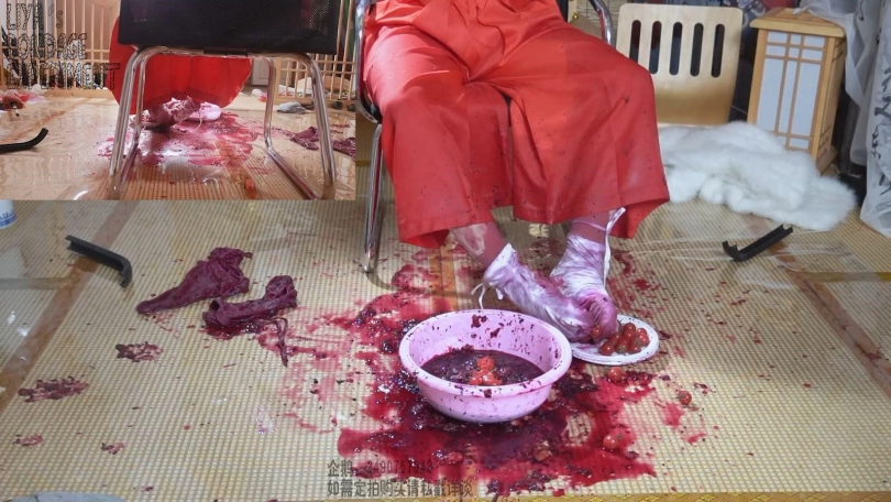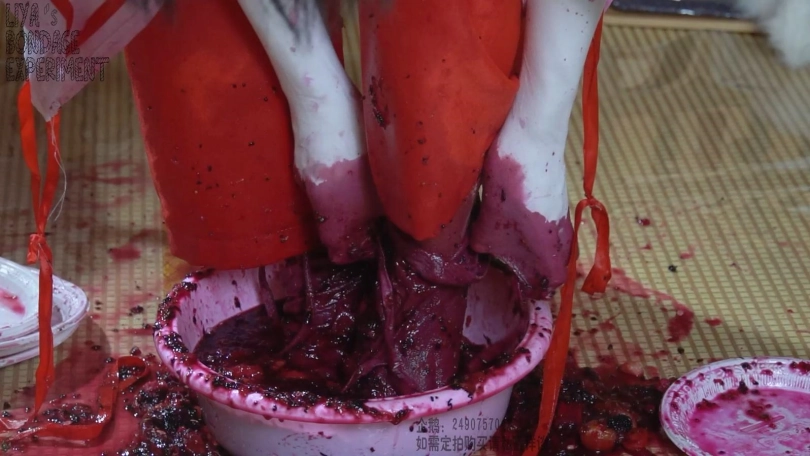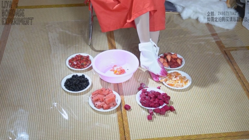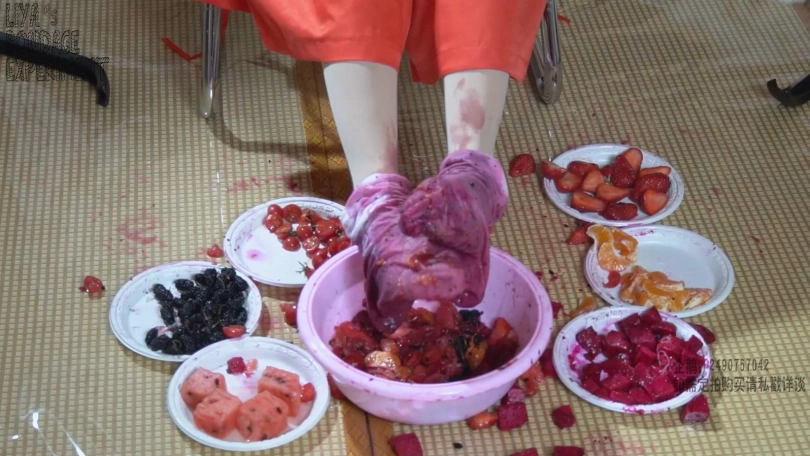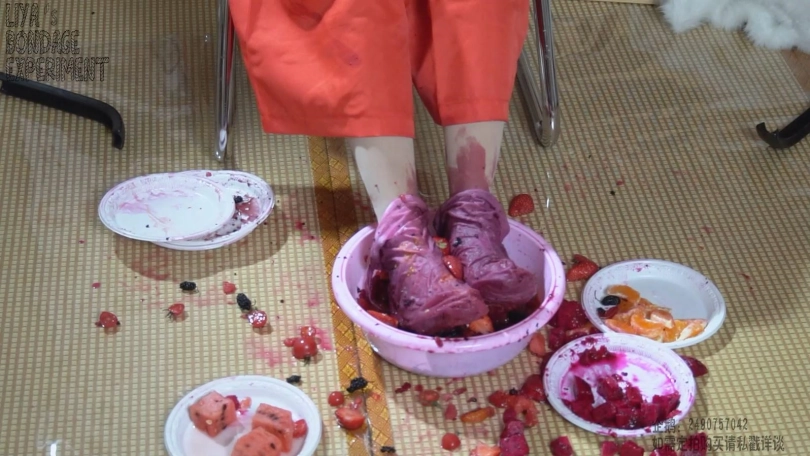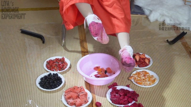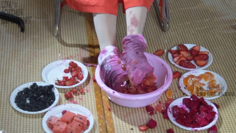 一、紧缚状态下将各种果切用脚夹碎,夹出汁水到盆中,然后将果肉丢入