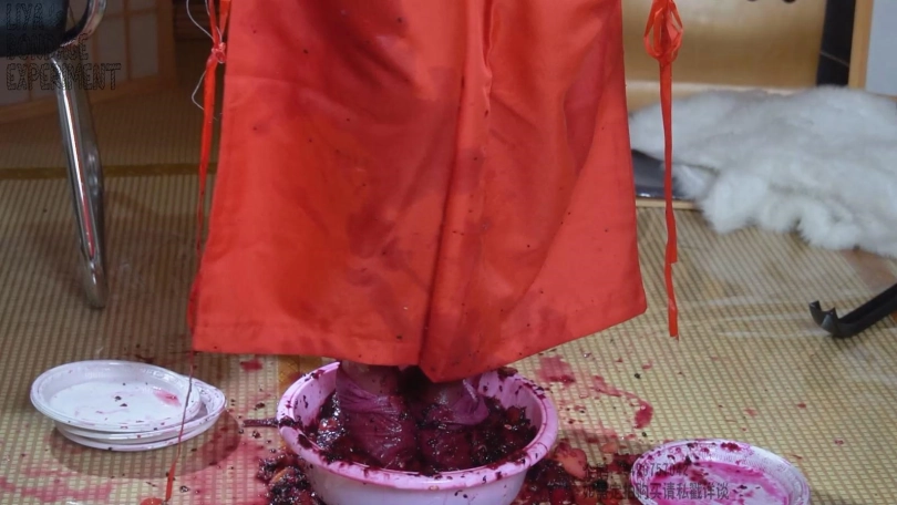 二、在盆中踩踏,将果肉踩得更加烂一些,偶尔提起裙摆,将一些果肉放入袜子中踩碎后倒出