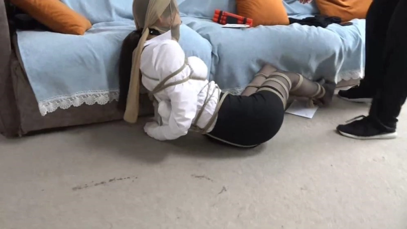 女人被拉开黑色头套,被用枪顶住脑袋,女人吓了一跳,接着给她一张字条,示意她念:当你踏进这个房间的时候,门会被自动上锁,炸弹将会自动启动,不要试图解开我,否则炸弹就会爆炸,我将与你同归于尽,办法在字条背面。女人奋力挣扎,试图用手去停止炸弹,发现手被包,有用脚指头去触碰炸弹,但发现也无效,一番努力后想起解除炸弹的办法在纸条,努力用脚把纸条转了个面,然后按照纸条上的字念:要解除炸弹的办法只有一个,就是用你的枪[X_X]我,如果你不想看到我害怕,就用那双丝袜蒙住我的眼睛,女人念完惊恐的呜呜叫,拼命挣扎。