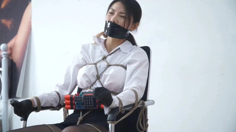 女人被绑在椅子上,努力挣扎,身上绑着炸弹,而手榴弹的引线被连接在门把手上,女人在椅子上努力要挣扎,试图挣脱束缚,不知道过了多久,门被慢慢打开,女人激动地对着门呜呜叫,接着手榴弹引线被扯断,女人激动地眼泪流了下来,她究竟能不能求救成功~