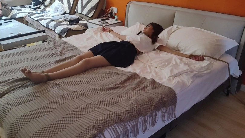 小蓝自己在家里玩镣铐,不知运气是好还是不好,竟然碰到了入室的小偷,于是便被绑起来收拾了。