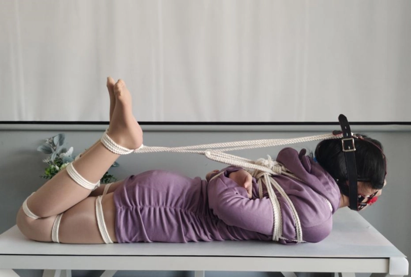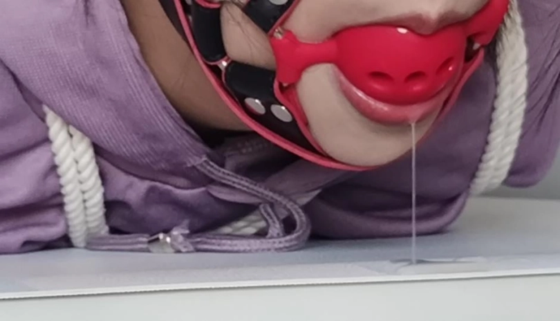 双腿被并缚着 手被捆绑着 嘴上戴着马具口球 想说话说不清 头又被强制牵着 动也不是不动也不是