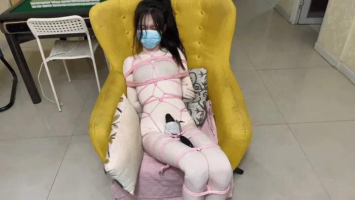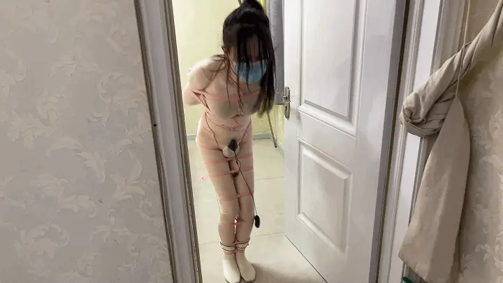 晴穿上紧身衣在床上被紧缚,上半身五花,下半身缚腿连接床头,再戴上训练器。