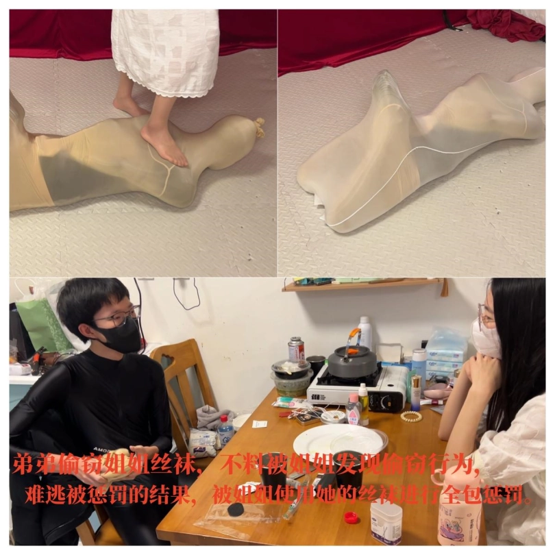 于是姐姐用自己穿过的丝袜将弟弟包裹起来,实行丝袜全包惩罚,弟弟全身上下都被姐姐的丝袜紧紧包裹,一条裹住双腿折叠起来,一条丝袜做成单手套将弟弟双手拘束在身后,再用裤袜将身体完全包裹起来,这次能好好和他喜欢的丝袜亲密接触了。颜老师将被丝袜全包的弟弟直接放在地上,任凭自己弟弟在丝袜茧里面挣扎,但是光滑的丝袜束缚了弟弟的身体,无论怎么挣扎都没有着力点,也不可能从姐姐精心包裹的丝袜茧里出来。