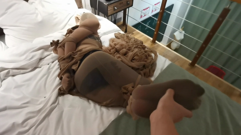 用一条肉丝单腿将瑾萱双腿套上,再用一条肉丝裆部剪开当衣服套上。瑾萱用几条肉丝把自己双腿绑上,再用几条后手直臂捆紧,头部也给套上一条肉丝。本来觉得肉丝捆绑应该比绳子好点,但实际是也挺痛苦,后期瑾萱已经开始发出痛苦的呻吟,痛苦的表情通过薄肉丝若隐若现。时不时挠下瑾萱的脚,双脚在袜子里束缚着,无助的扭动。。