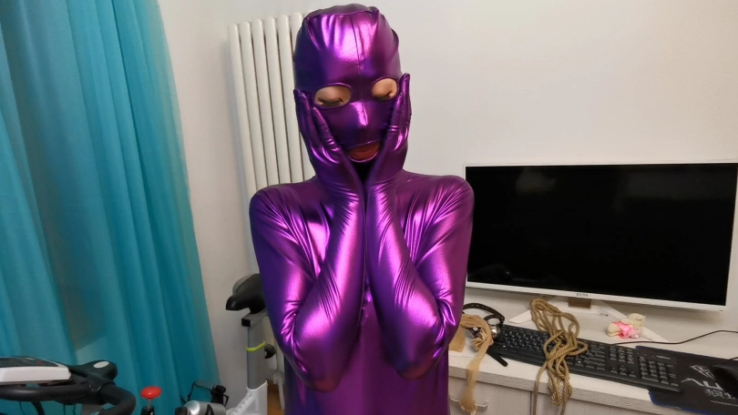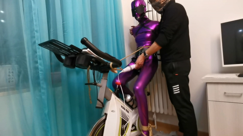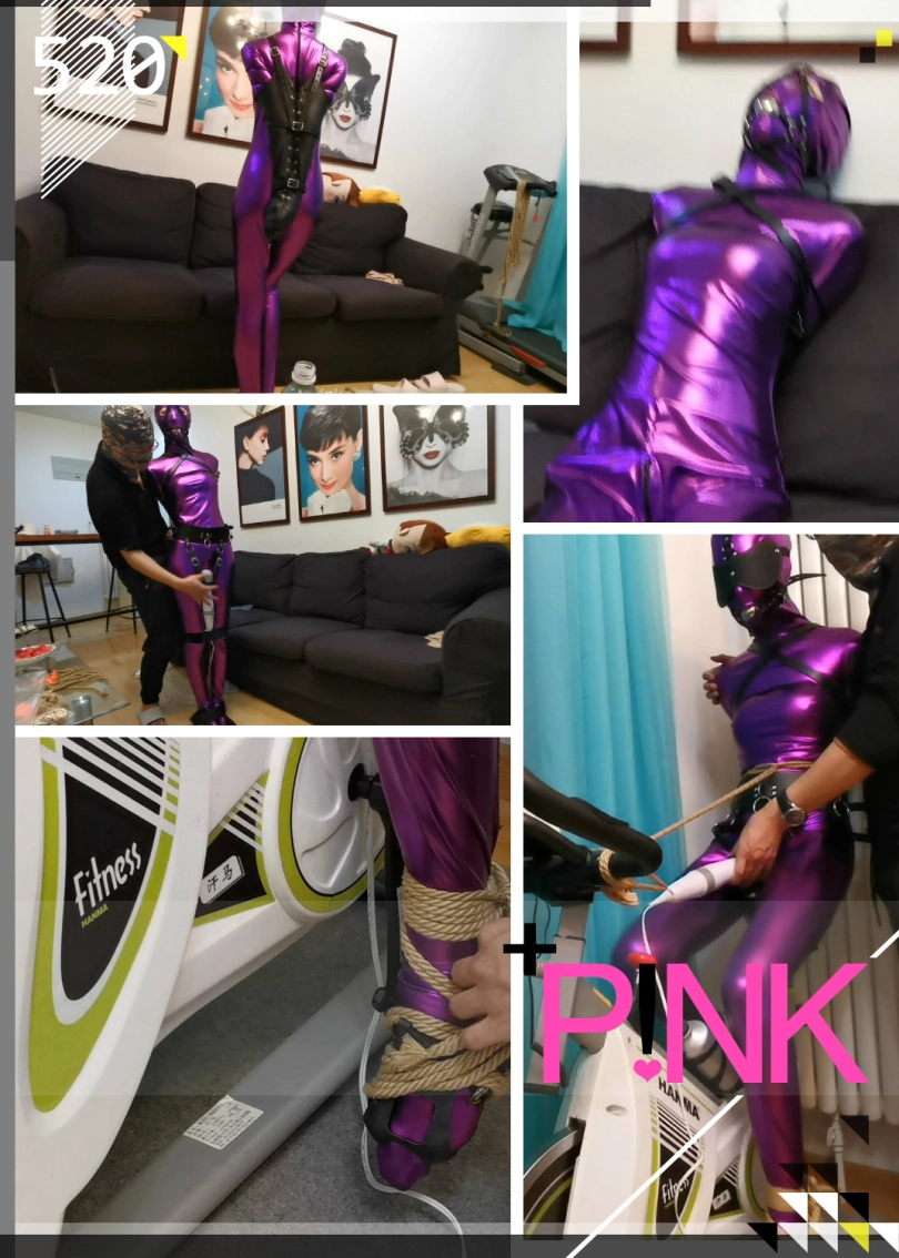 这次让凌薇穿上件紫色胶衣,并用单手套束缚住,嘴里带上马具钢球口塞,下面用束缚带绑着棒子强制刺激。随后将其固定在单车上,一边忍受着下面棒子猛烈刺激,一边不能停下来骑行单车。强制刺激下GC起伏不断。。。