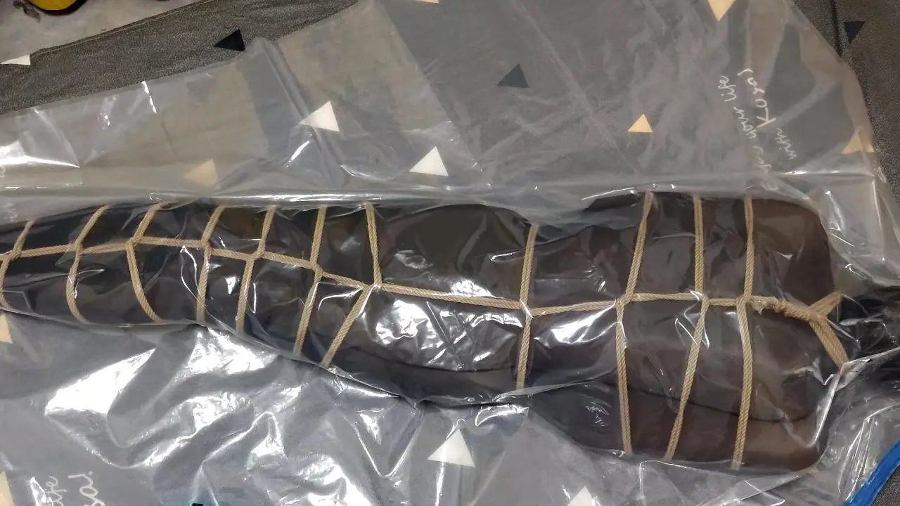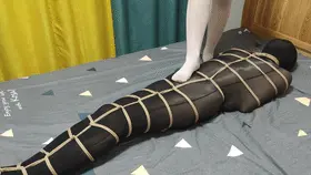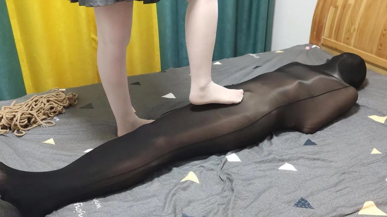 小男M被全包丝袜包裹全身,白丝脚踩在他的身体上,小M身体享受的扭动着。最后装进真空压缩袋。