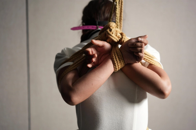 七七进来就被灰太狼胸缚,胸部在绳子的束缚下感觉要爆出来了,戴上眼罩后裙子越来越短,翘臀让人忍不住拍打,下面也被绳子勒的容隐若现,戴上口球的七七更是口水拉丝,全程“啊……呜呜……哈哈哈……啊啊啊……”呻吟声不断,脚铐和筋膜枪的加持,更是让七七欲罢不能,只能乖乖被驯服。呻吟声萦绕耳畔!