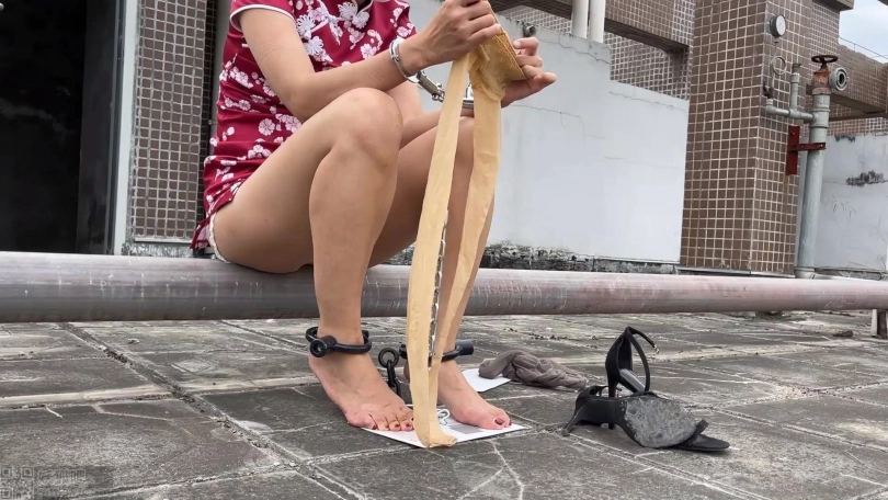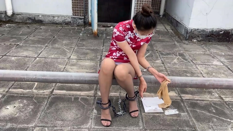洋洋因贩毒被当场抓获,搜查官要求洋洋戴手铐脚镣在户外指认现场,为了让洋洋配合交代,特地在指认时在大庭广众下让洋洋换上开档丝袜,在敏感处放上[X_X],进一步磨灭洋洋的意志,使她心里防线彻底崩溃,旗袍丝袜高跟凉鞋,戴着镣铐换丝袜