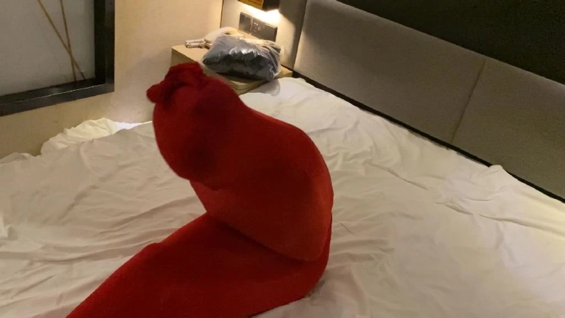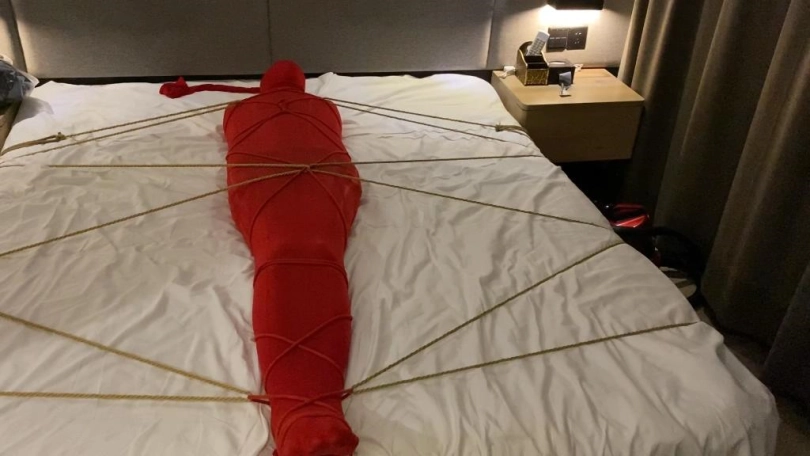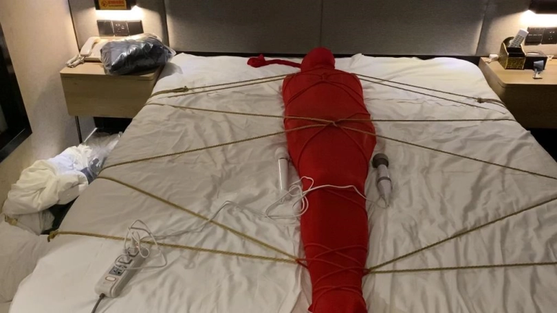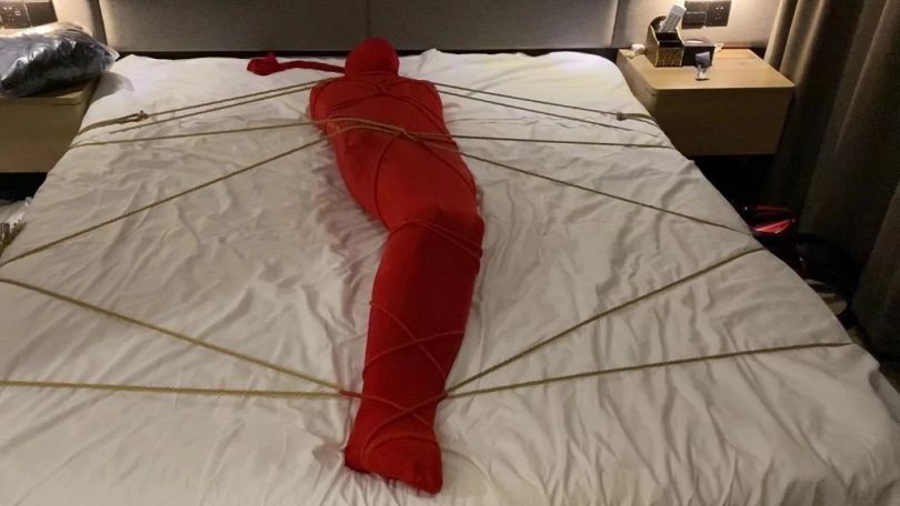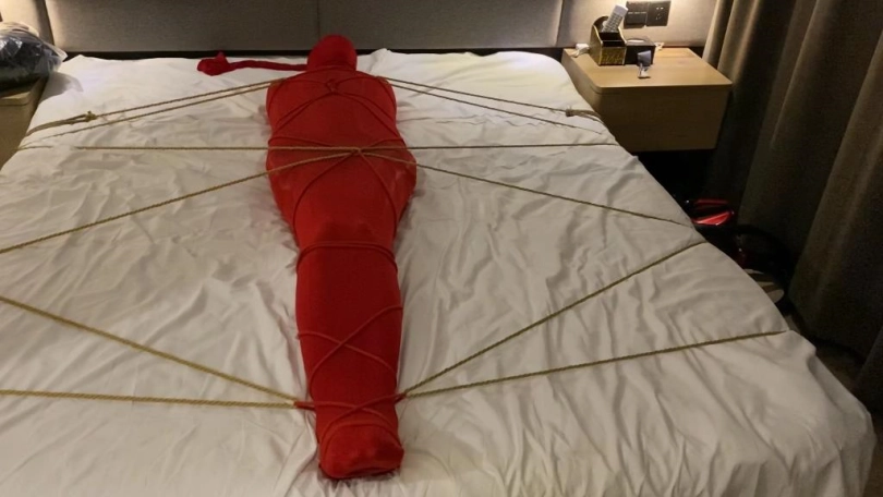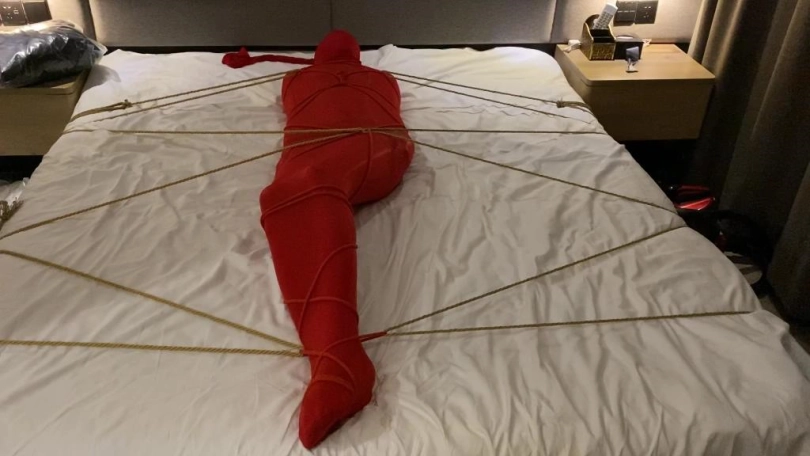 一动不动的感觉 四双超紧丝袜睡袋包裹上还能挣扎还能动 直接红绳子缠绕全身 床下铺麻绳变成绳网 上下左右全部被限制 全包紧缚加AV棒强制