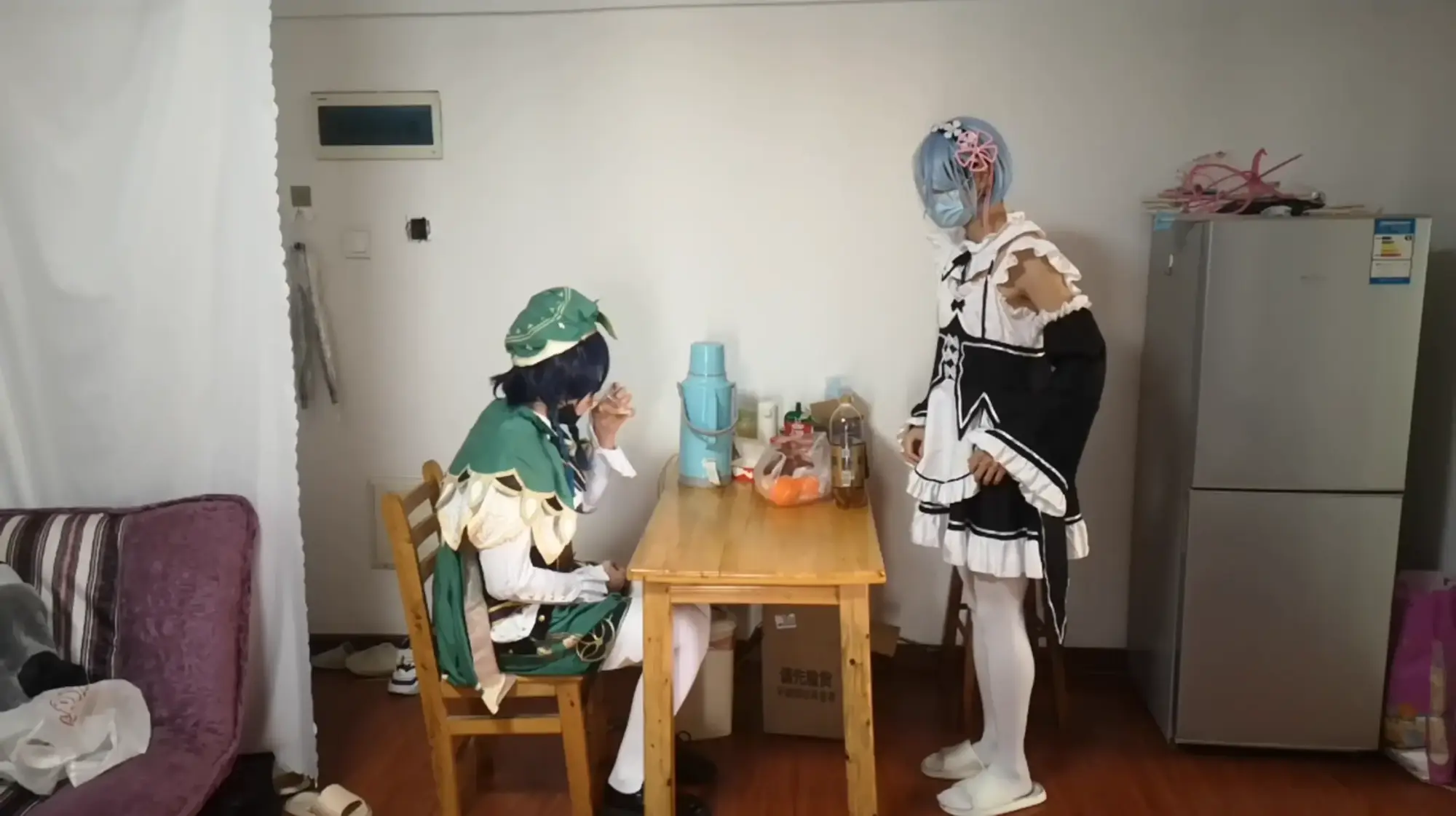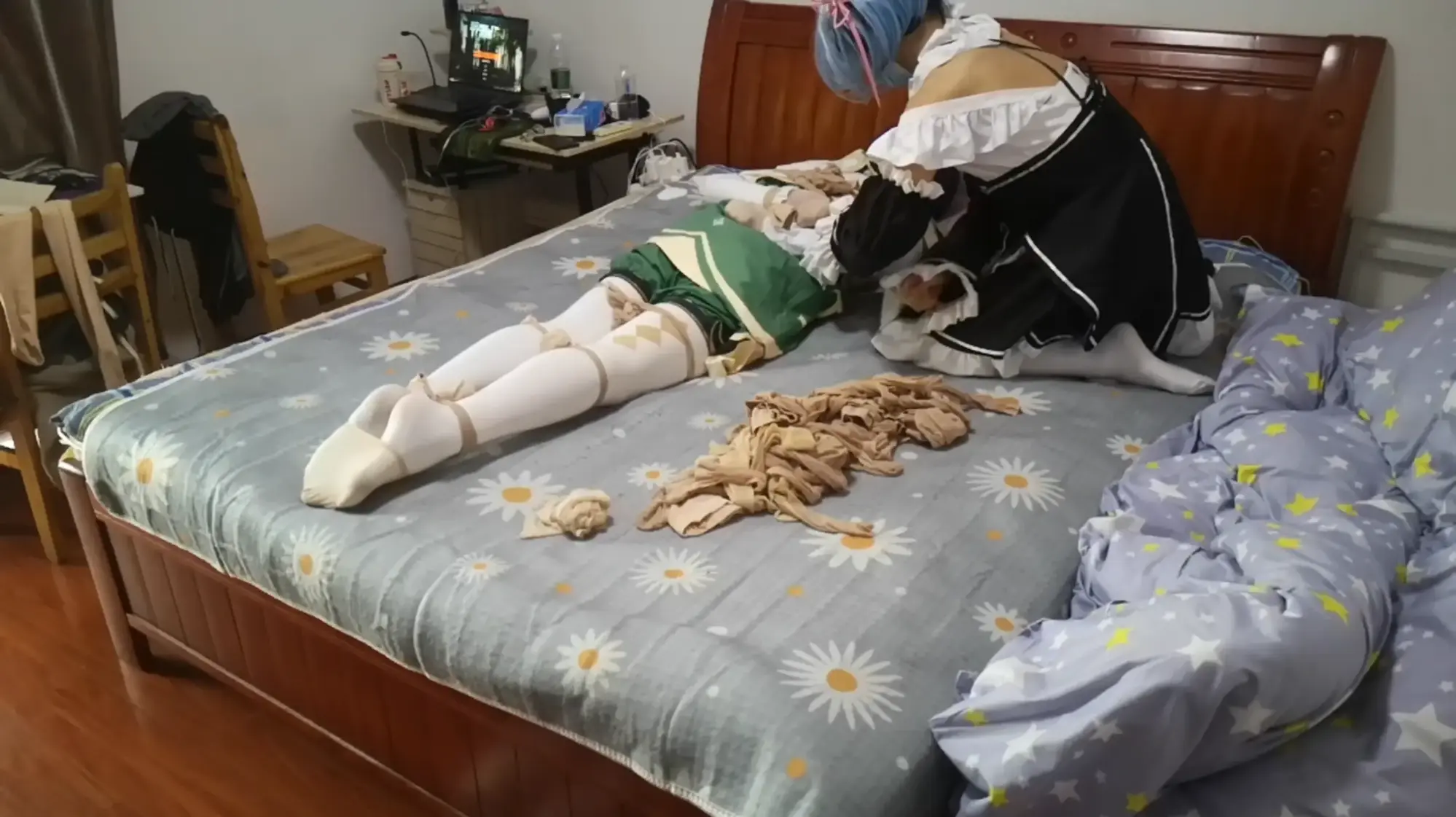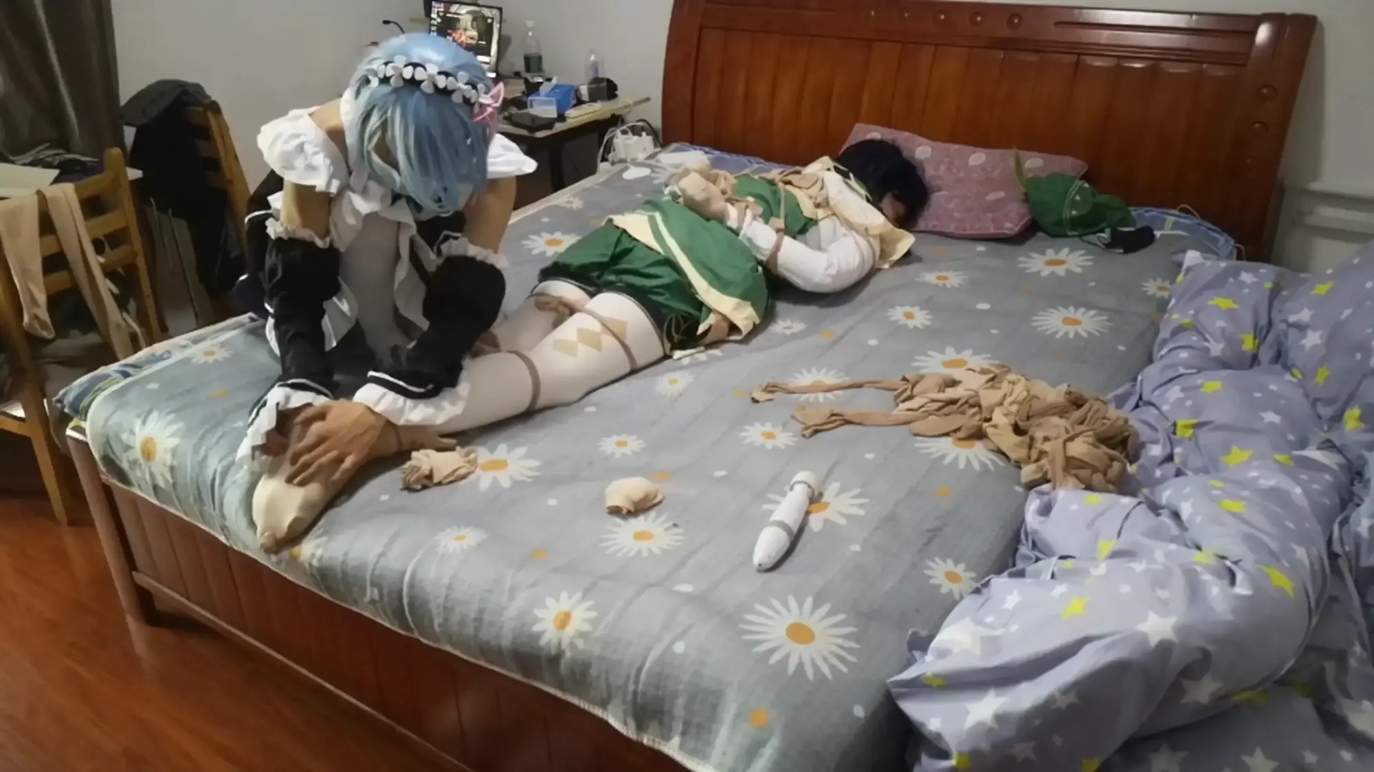 蕾姆为温迪准备了他喜欢的苹果酒,看着温迪品尝饮料,心里却想的是品尝温迪。将他用丝袜捆绑之后亵玩挠脚,奈何中途被温迪挣脱束缚,反被自己的迷药拿下随后丝袜套头全包,温迪逃走。