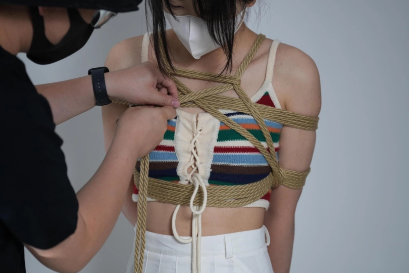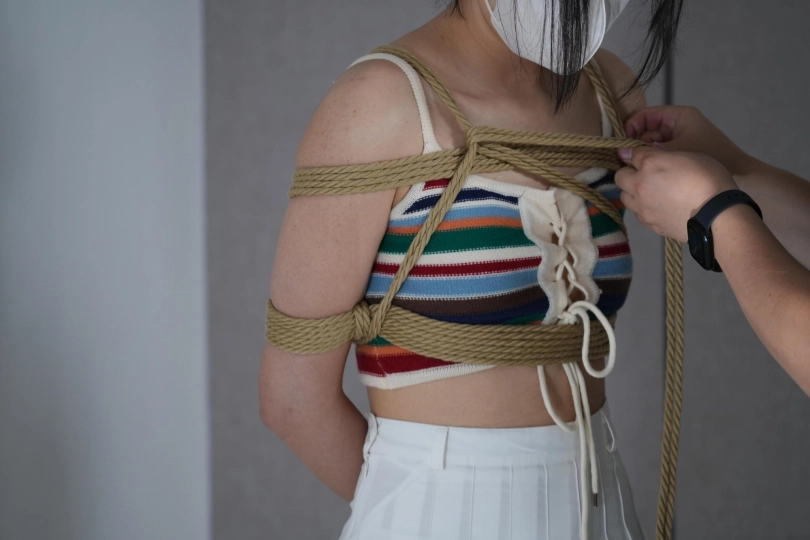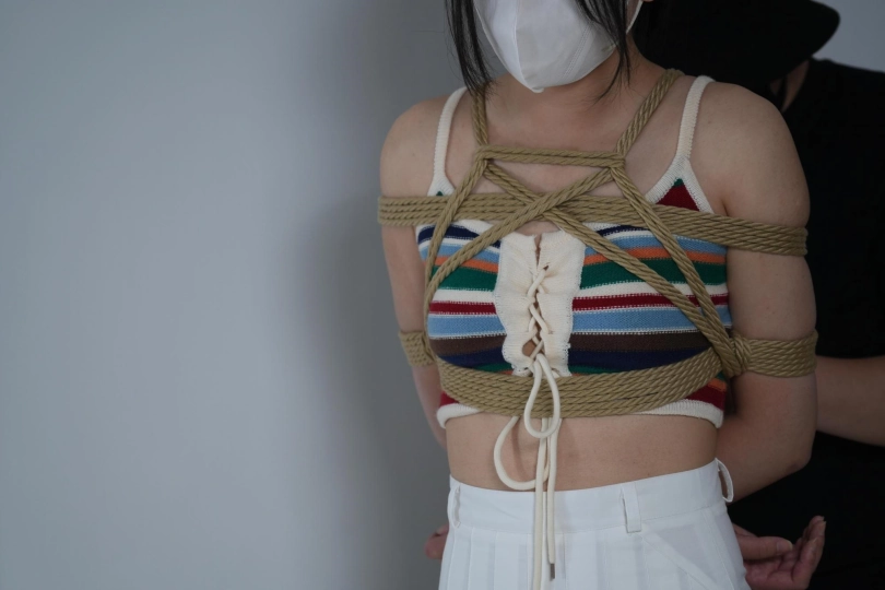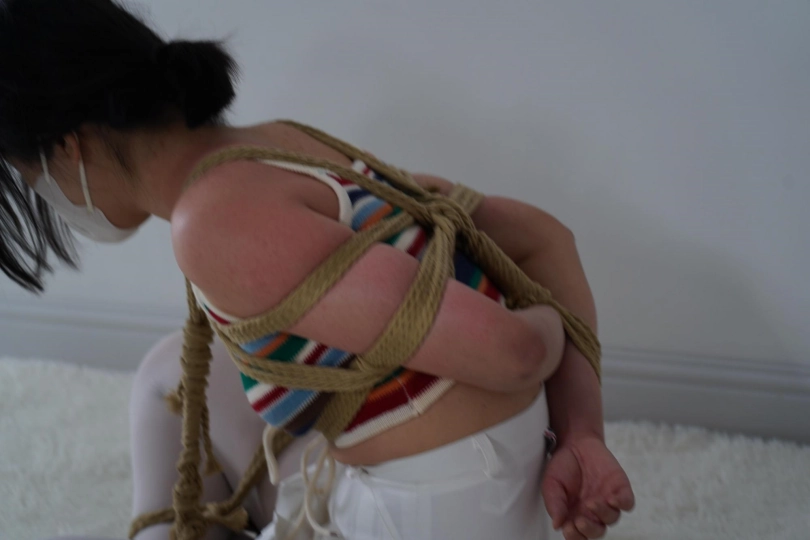 筱筱刚还在美美的自拍,下一秒双腿就被固定在的凳子上,脖子也被小狗项圈吊着,手脚被铐子拷起来,用铁链连接,一弯腰脖子就被拽的生疼,还没反应过来,灰太狼就拉着筱筱做游戏,刚开始筱筱非常卖力,但灰太狼耍赖无论回答正确还是错误都逃不过惩罚,脚心,胳肢窝等各部位被各种工具挠了个遍。还不罢休的灰太狼又用绳子在她身上捆绑,胸缚+双腿折缚+团缚一系列捆绑,让筱筱的皮肤上留下道道红印,重心不稳的她从一边倒下,连穿的内裤都被暴露在外面,虽然来回扭动挣扎着,但依旧逃不掉一番折磨