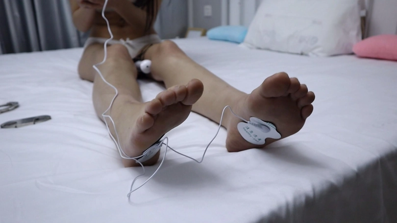 用大号扎带紧紧绑住全身,从手到上半身到腿到脚到脚趾,完全动弹不得,加上口球,整个人只能像蛆一样蠕动!同时配合固定住棒棒强G,脚心贴上电极片,整个人又舒服又疼又动弹不得,一个崭新的体验!