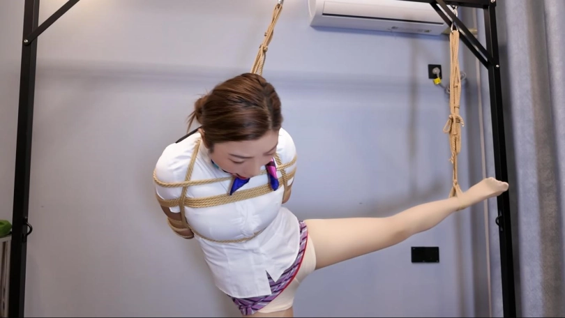 后手观音是佳佳长项,但是后手观音在吊起来一只腿,并且带上口塞,半小时不许摘,这是个挑战,还请拭目以待吧