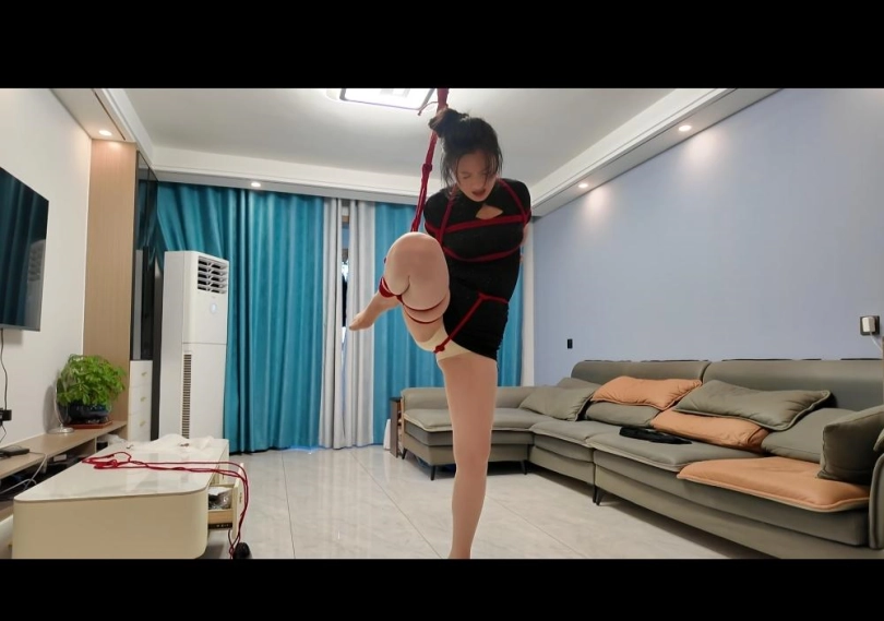 紫涵被红绳紧紧的捆绑着,股绳也深深的勒进去、吊起一条腿,剩下的那条腿也只能脚尖着地,疼的她直说脚趾快断了....最后只能求助主人放开