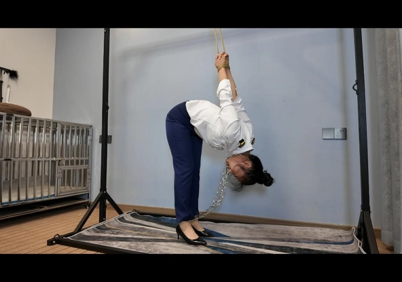 后手高高吊起,脖子用铁链子拴着,连到脚腕,脚腕也要带上手铐,这个姿势特别难受,还要求必须坚持一个小时,这家伙,可是把紫涵吊惨了,放下来说腰都快折了,躺地上休息了半天才起来