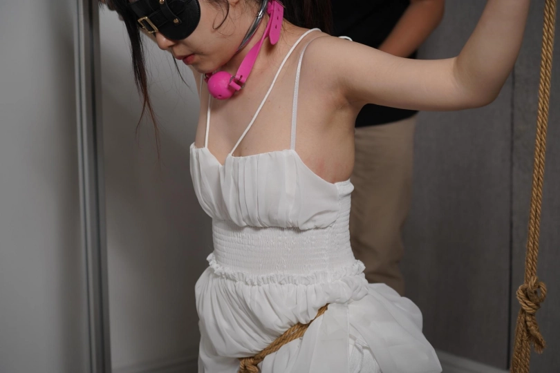 好久没约绑的莎莎主动发消息来当绳艺模特,既然都开口了也不好意思拒绝,换[X_X]带连衣裙,上半身显得清凉无比,灰太狼提前放好木板将铁架按好,还没来得及看一眼的莎莎就被戴上了眼罩,灰太狼带她走到铁架前命令她跪下,她乖乖听从,任由灰太狼摆布。双手戴上手铐被固定在铁架上,脖颈也被吊了起来,木板太过生硬,莎莎尝试着缓解一下膝盖的酸痛,看到这一幕的灰太狼马上找来了扎带将脚腕固定在两侧,越拉越紧,拉不动后才收手;灰太狼取出提前准备好的柠檬片骗莎莎张嘴塞进去,毫不知情的莎莎试图吐出却别硬生生塞了进去戴上口球,灰太狼不停的来回抚摸,用电动牙刷挠痒痒,脚心,胳肢窝,胸前都不放过,只能隐隐约约听到莎莎“放开我~~呜呜呜 ~~”的声音,胳膊不停的拍打着铁架!在一番调教下,嘴里的柠檬也发挥了作用,口水不停拉丝流下,这羞耻的一面让莎莎面红耳赤,哼哼唧唧的叫喊,像极了受刑的犯人,不知道等待自己的是什么.......