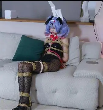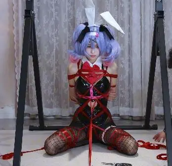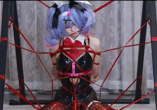 模特倩倩,cos系列,红丝带M腿全身捆绑,并且连接在架子上,再用绳子全身紧缚。