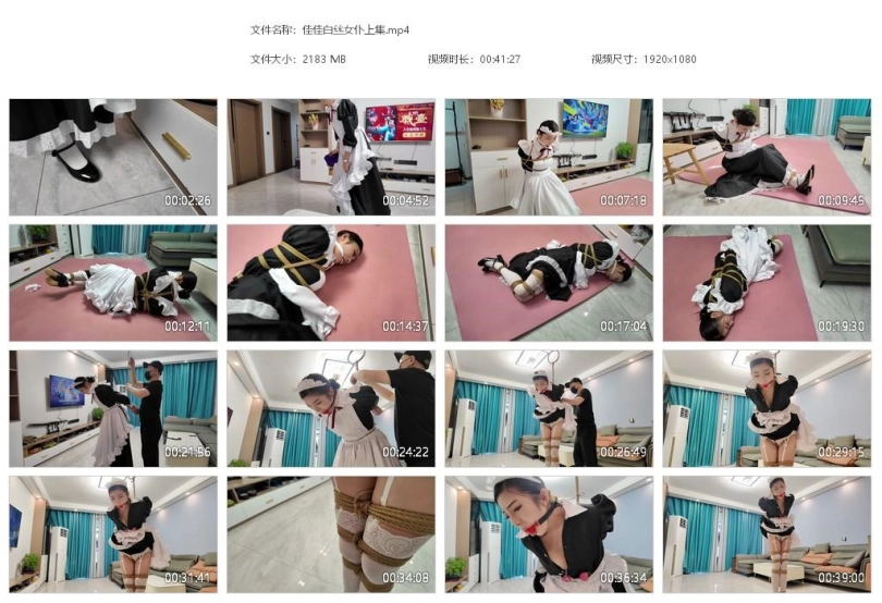 【视频时长】:00:41:26 【文件大小】:921MB 男子将绑架来的人妻装箱带走。回到家后开箱,经过一个月短暂的调教,佳佳暂时成为男子家中的女仆。不过这只桀骜不驯的小野猫似乎不太好训,于是男子借佳佳摔碎碗的契机,再次展开调教。他将佳佳绑好在客厅中,假装要离开。佳佳见机会难得,于是便努力挣扎,试图去到窗边呼救。就在佳佳快到窗边时,男子一把抓住佳佳,把她从希望的边缘一把拉了回去进一步调教。接着男子在客厅中吊起佳佳后手,给她戴上口球并且用绳子拉起口球带,强迫她抬起头,然后拉起裙子绑上股绳再扒开佳佳胸前的衣服,往两胸各塞入一颗[X_X]。只见佳佳被[X_X]刺激得口水直流站立不安,下身又被股绳勒住,只能不停地发出呜呜声祈求男子放过她。再往后,男子决心一步到位,接着将佳佳绑成个单腿吊缚,并且在下身加上个棒棒,两胸前的蛋也调至最高档,就这样,将佳佳调教至几近虚脱。最终,桀骜不驯的野猫终于被驯服,含住了象征屈辱和臣服的水晶柱,就这样佳佳调教成功,正式成为了男子家的奴隶女仆。开头的开箱环节是上回拍的时候让老哥顺便给拍的,开箱环节看得真爽。这回为了想看到的经典英伦风格女仆专门去按照佳佳的身材定了一件,白丝也换成稳重沉稳一点的,效果也是非常棒。全片一共三个段,因为时长和大小限制就先分成上下集了。老哥那拍摄的手法和认真程度真没的说,一如既往地敬业,我想看的就是这端庄典雅的女仆被一点点调教得下流,衣服从穿得整齐慢慢变成暴露又凌乱不堪,在这部里都给拍出来了。特别是佳佳这次化妆的妆容比第一集的效果还棒,挣扎的表演也是一如既往的卖力,第二段的时候戴上口球后口水流了满地。 ![]() ![]() ![]() ![]() ![]() ![]() ![]() ![]() ![]() ![]() ![]() ![]() ![]() ![]() ![]() ![]() ![]() ![]() ![]() ![]() ![]() ![]() ![]() ![]()