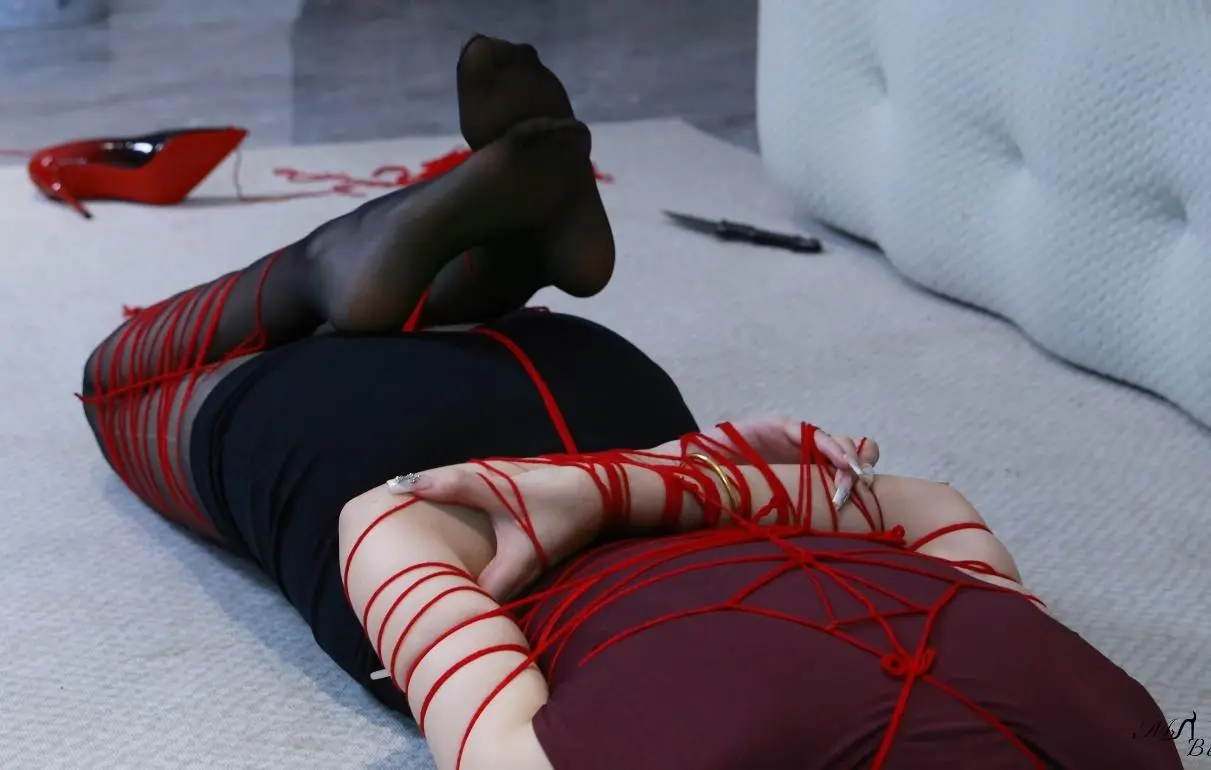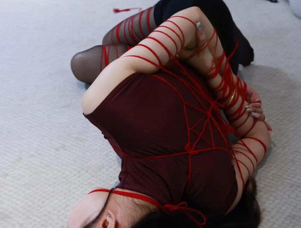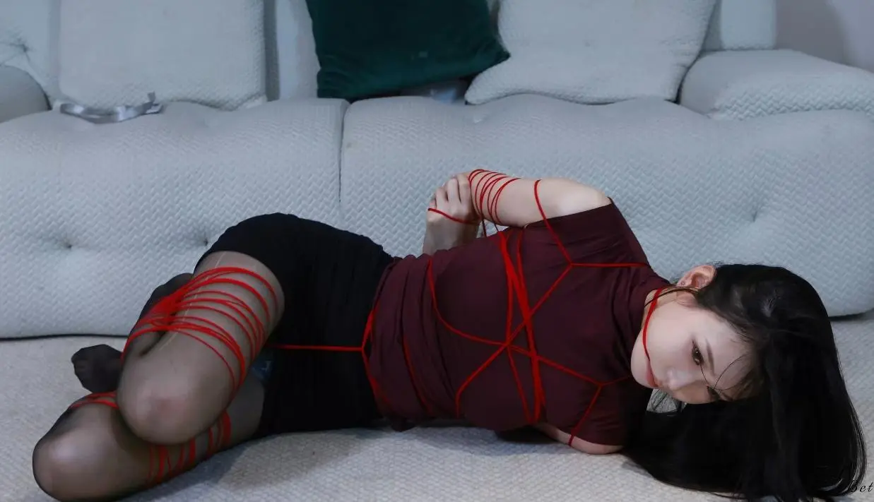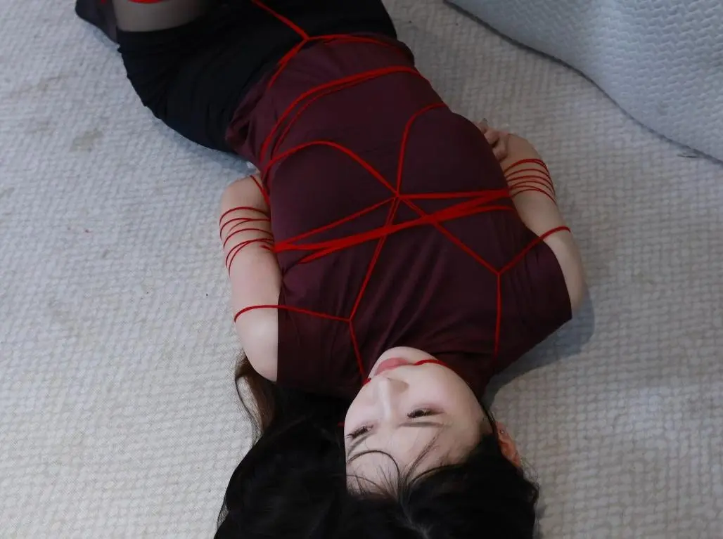模特倩倩,两个妹子玩游戏,输了的接受捆绑惩罚,被大量红毛线捆绑,后又被轧带捆绑,湿身诱惑。