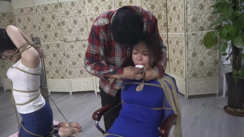 女儿被绑在柱子上,母亲绑在椅子上,内裤堵嘴,二女并排放置。