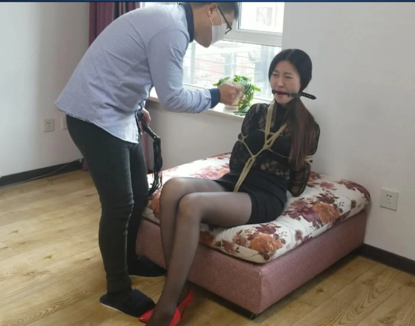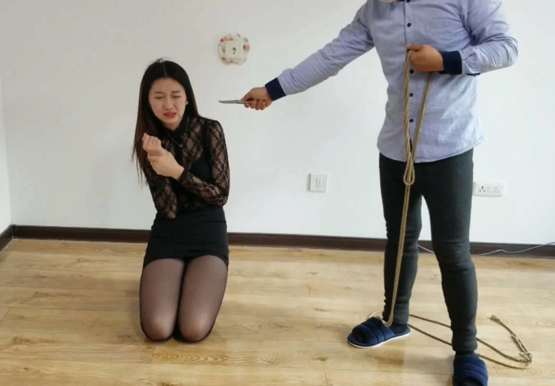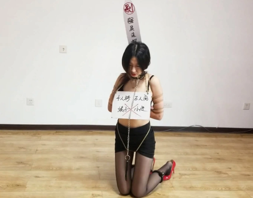 5.变态杀人狂强奸完小曼,将她拉到大厅,令她跪下,上身五花大绑,双腿间也绑上T字股绳,双脚戴铁镣,并打开手机放在一边进行拍摄,说要让录成视频,让大家都看看淫妇骚婊子的下场。准备完毕,变态就给小曼挂上胸牌(上写: 千人骑 万人肏 下写:婊子小曼,打上红叉),扮成女死囚的样子,鞭打屁股,还性器羞辱,最后还把假阳具挂到小曼胸前,拉着她假做淫妇游街的样子。游街完毕后,又令小曼跪下,给她插上处决的亡命牌(上写:剐骚屄淫妇小曼 剐字画红圈,名字打红叉),声称要替天行道,将小曼这个害人的骚婊子凌迟处死。小曼哀求饶命,杀人狂不理,拿起相机给她拍摄遗照,之后又令小曼跪着,拿起挂在她胸前的假阳具在她嘴巴抽插,并一直羞辱她。