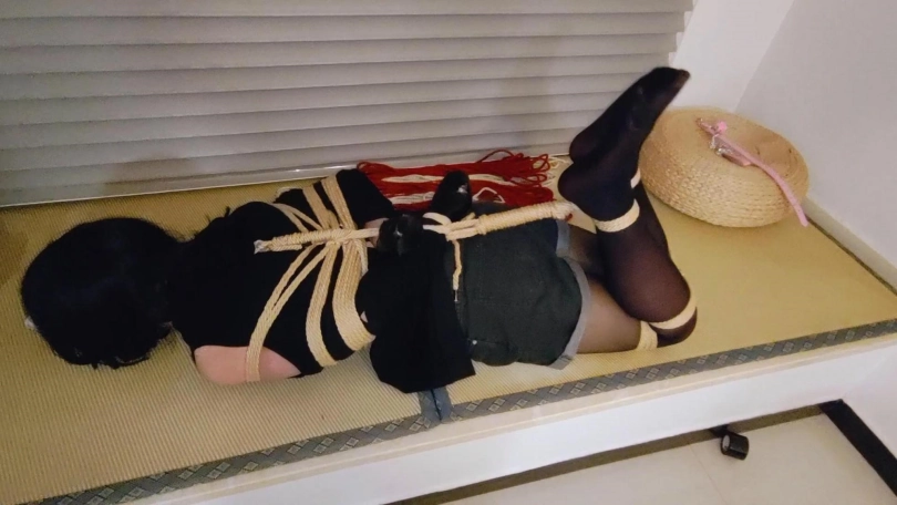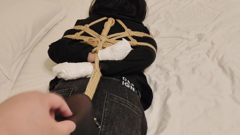 深色紧致的牛仔裤加上黑丝被驷马紧紧的捆绑在床上,双手也被白色胶带紧紧包裹,嘴里塞满了丝袜然后固定了胶带,在热裤下肉感的双腿和泛着粉色的脚心显得格外诱人最后被TK折磨到没有一丝力气后被丢弃在房间里自生自灭..