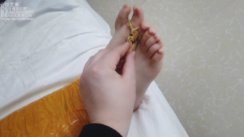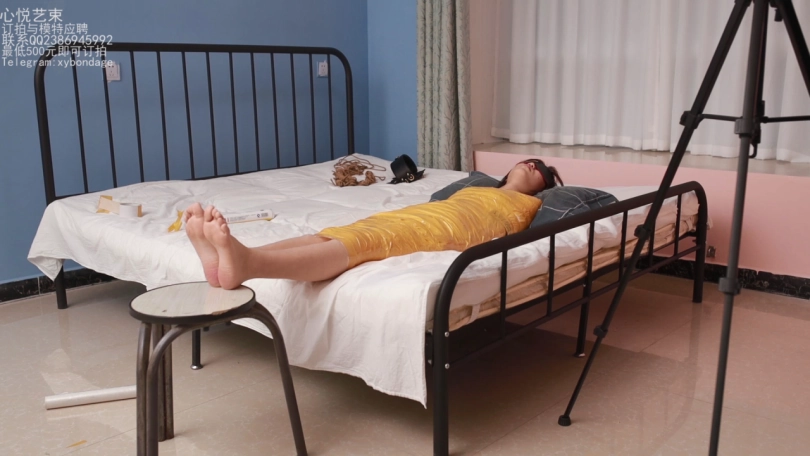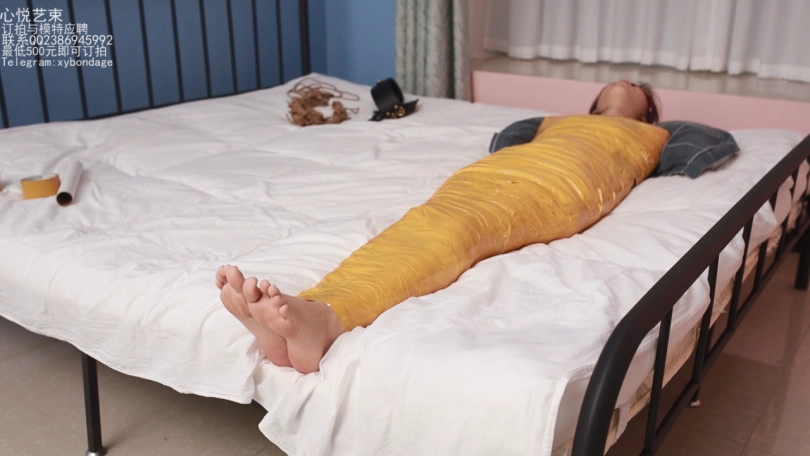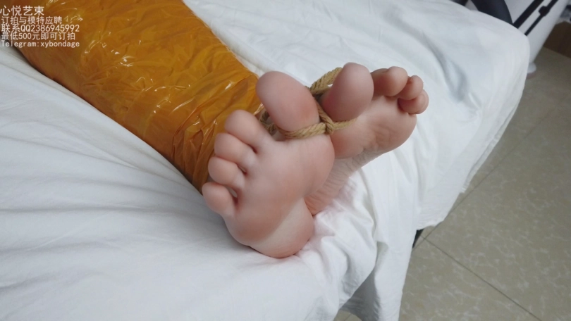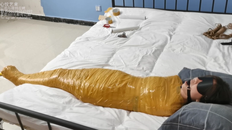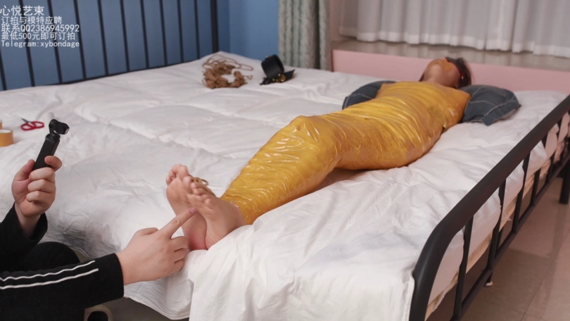 这妹子头回拍摄有点害羞拘谨,被用保鲜膜和封箱胶带死死包裹,只留一双小玉足在外面承受骚扰,最后小玉足也被保鲜膜和胶带包裹严实,全身上下化身蝉蛹,再堵上口球,一动不能动了呀。