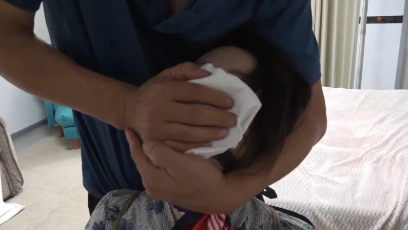 拿出一条黑色长筒袜把空姐头套上,袜子另一段绑在背后的绳子上。