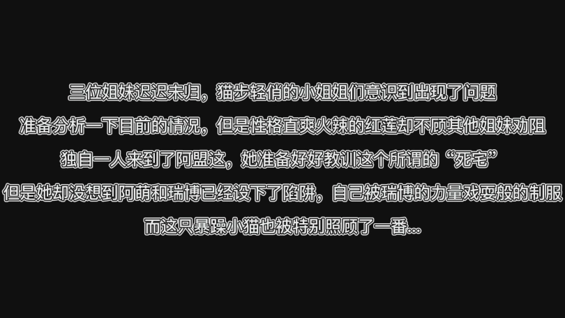 【视频时长】:00:26:32 【文件大小】:941MB 三位姐妹迟迟未归,猫步轻俏的小姐姐们意识到出现了问题 准备分析一下目前的情况,但是性格直爽火辣的红莲却不顾其他姐妹劝阻 独自一人来到了阿盟这,她准备好好教训这个所谓的“死宅” 但是她却没想到阿萌和瑞博已经设下了陷阱,自己被瑞博的力量戏耍般的制服 而这只暴躁小猫也被特别照顾了一番... 佳怡饰演红莲(主演部分) 琪梦饰演墨桐 这是第三次定拍佳怡小姐姐,觉得表现越来越好!有机会还会继续合作!琪梦小姐姐的一些镜头神颜是真的好看!希望喜欢的小伙伴多多支持!您的支持就是我持续更新的动力! 同时回顾一下之前剧情,没有看过的感兴趣的小伙伴可以查看我的主页和列表 1,路家世代守护着神秘的宝物,经常有厉害的神偷尝试窃取,但是均以失败告终,这次前来挑战的是猫步轻俏的美女小姐姐们... (对应猫步轻俏4集,当时还没有给角色命名,在后续视频会有角色名称) 2,路家的宝物没被偷走,但是却遭到神秘组织的袭击而丢失,路家委托侦探苏心然调查和找回宝物, 于此同时苏心然也接到了一个新的委托... (对应缚之轨迹10集) ![]() ![]() ![]() ![]() ![]() ![]() ![]() ![]() ![]() ![]() ![]() ![]() ![]() ![]() ![]() ![]() ![]() ![]()