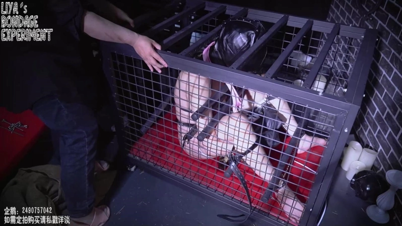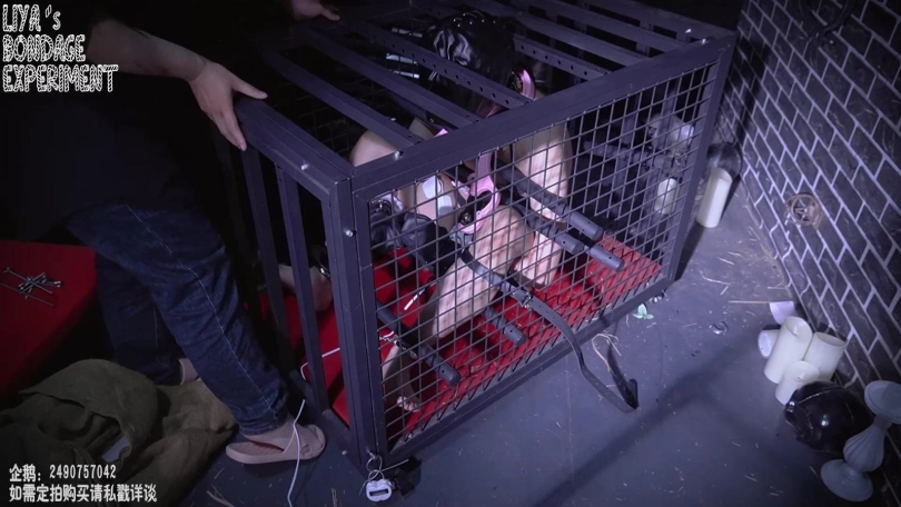 这次莉雅进行打算进行一次长时间的挑战,首先褪去自己的服装防止藏东西,然后将用于刺激道具固定在自己身上,由助手严密的将手部多层缠住后锁在背后,将头一层一层包好,打开所有器具调高确定呼吸情况后,引导进入铁笼中,增加铁棒、皮带和拘束具,固定在铁笼中开启所有器具开始了长时间的折磨