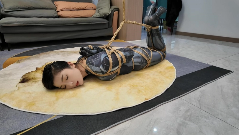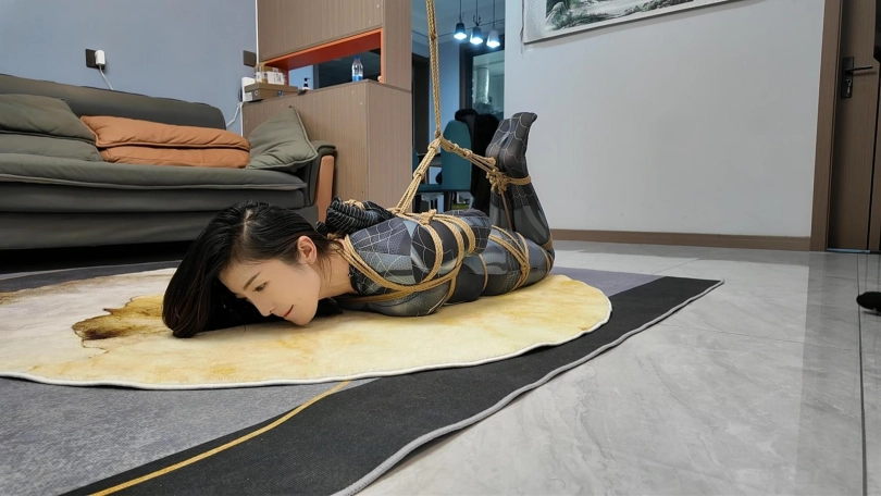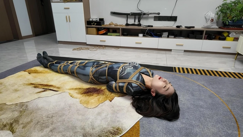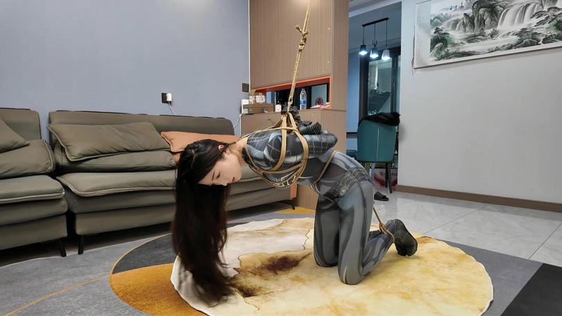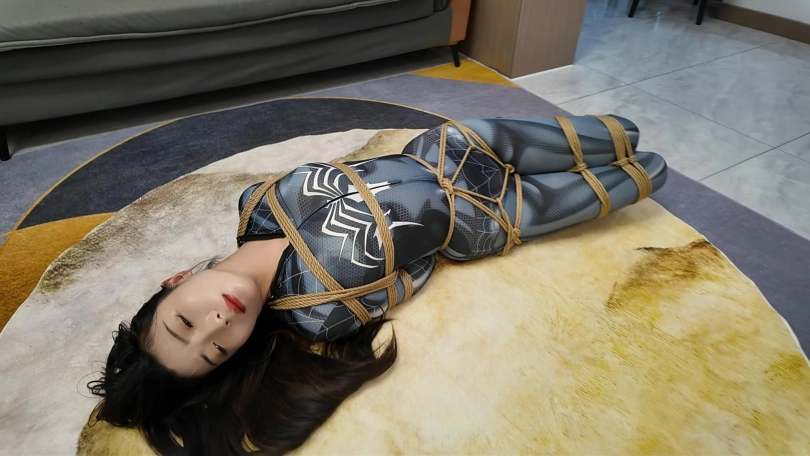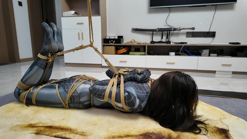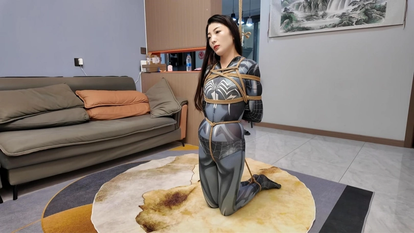 女蜘蛛潜入房间搜查,被抓获捆绑,股绳套在双脚上,一动就会扯动股绳,上半身吊起,这个姿势还是很难受的,并且会紧紧勒着下面,刺激着下面,接下来后手观音驷马更是加大难度,这个女蜘蛛被束缚的可惨了.