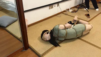 下身:并腿绑四道,大腿根部一道,膝盖上下各绑一道,脚踝处绑一道。(绑法上面绳子绑的紧一点就行不要看起来松松垮垮),后面连起来驷马捆绑放置可以带一点挣扎。