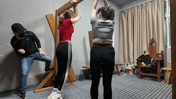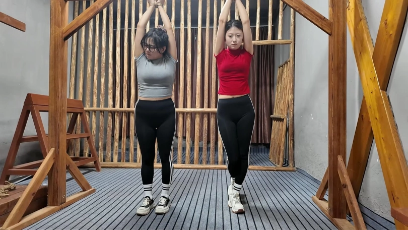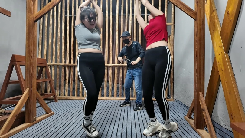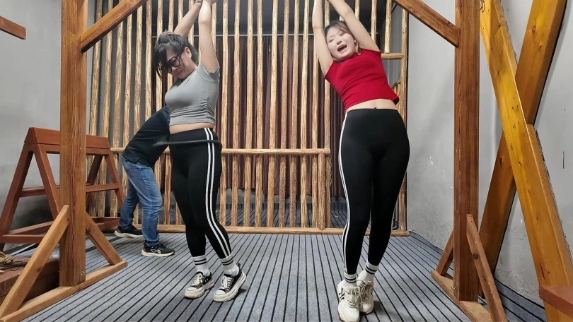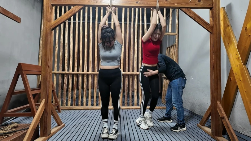 两名女孩踏青,在野外玩SP游戏,玩的正酣,不料被一名神秘男子从后面捂住口鼻,接着又把被绑着的女孩捂晕,把她们带到一个废弃的院子里面,双双绑到老虎凳上面,TK,双双吊起来SP,左右开工,好不快活,最后竟然拿出双棒棒,同时用棒棒刺激两名女孩..