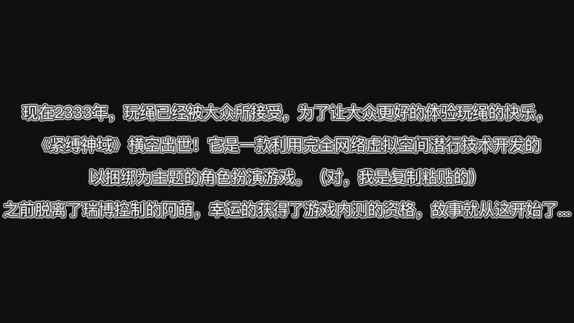 现在2333年,玩绳已经被大众所接受,为了让大众更好的体验玩绳的快乐,《紧缚神域》横空出世!它是一款利用完全网络虚拟空间潜行技术开发的以捆绑为主题的角色扮演游戏。