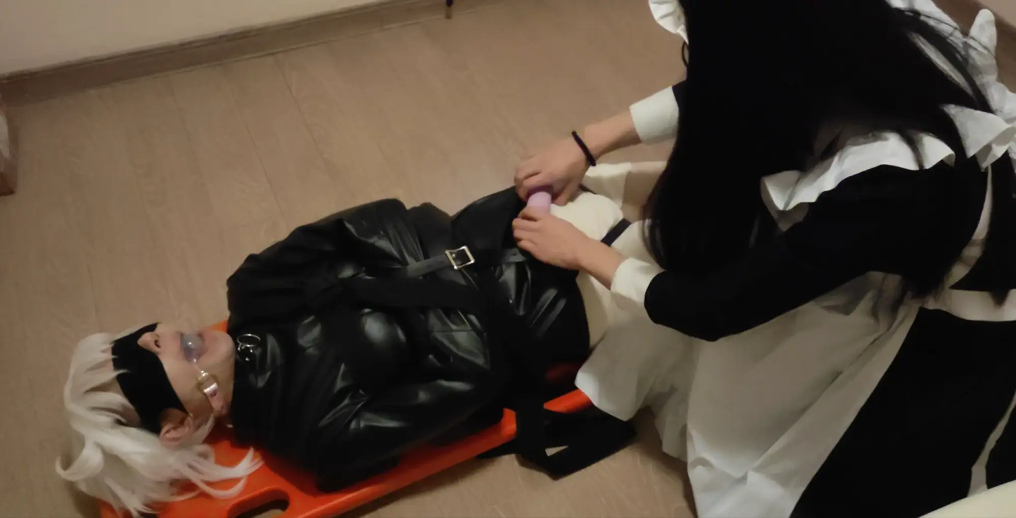 一名女仆被束缚在救生板上无法动弹,她的同伴却拿着震动棒在她身边恶作剧般地挑逗戏弄,不断在对方身上游移,期间坏坏女仆还与被束缚的她玩起了tk游戏,让她满脸通红却又无可奈何。两人沉浸在这场充满笑声与喘息的束缚游戏之中。