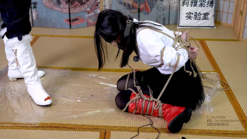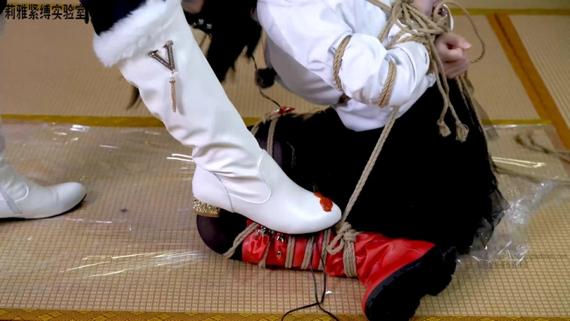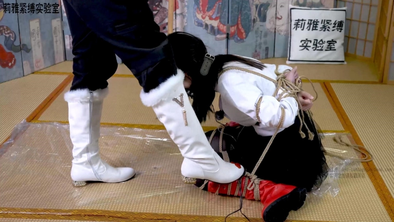 之后奶酪被绑成蟹缚,带上了口枷,歹徒在靴子上挤上了番茄酱要求奶酪舔舐感觉,奶酪努力挣扎换来的是被歹徒用靴子狠狠地踩在身上,最终踩得身上疼痛难忍只好屈服,伸出舌头一点点舔舐歹徒靴子上的番茄酱