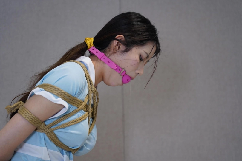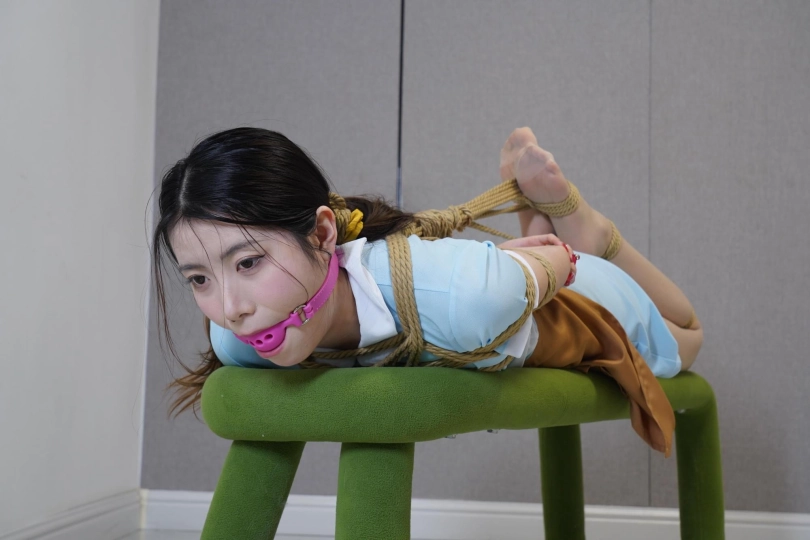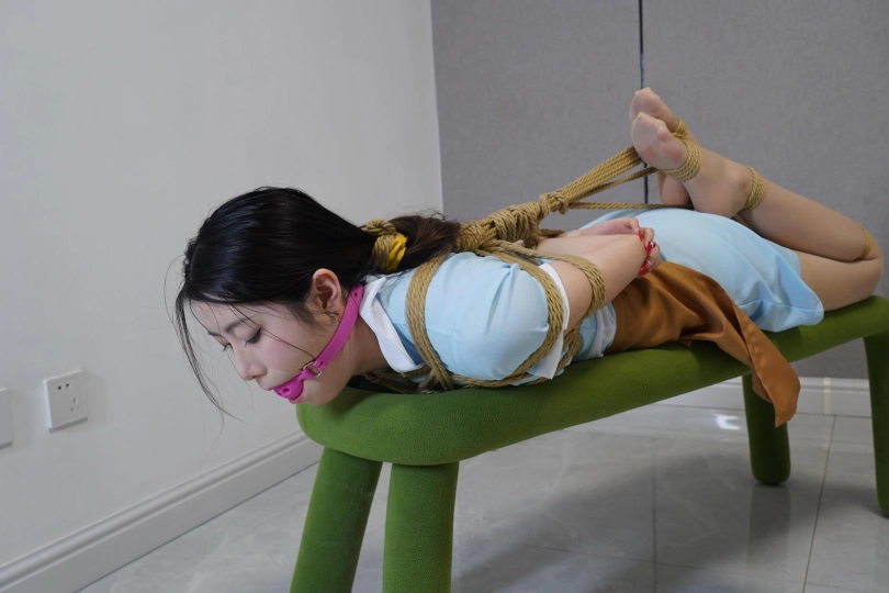 享享今天扮演的角色是好利来女仆,用手铐将她反手固定住,再去接弹射起来的小恐龙,可惜只接住了一只黄色小恐龙。享享只能体验一下提前为她设计好的惩罚啦~先用绳子将她的上肢固定住,享享用力蠕动,都无法摆脱绳子的紧紧束缚。再依次叠加惩罚,用粉色口球将享享的嘴堵住,跪着~站着~享享的嘴里全是口水,口水顺着口球流了下来,滴落在了地上,享享看着口水一直流,却无法控制~接着就是驷马缚体验,将头发、上肢与脚绑缚在一起,绳子拉拽着头发,她不得不将头抬起来,享享戴着口球,只能任凭口水滴落在地上,再叠加挠痒痒惩罚,她只能趴着等待惩罚结束~