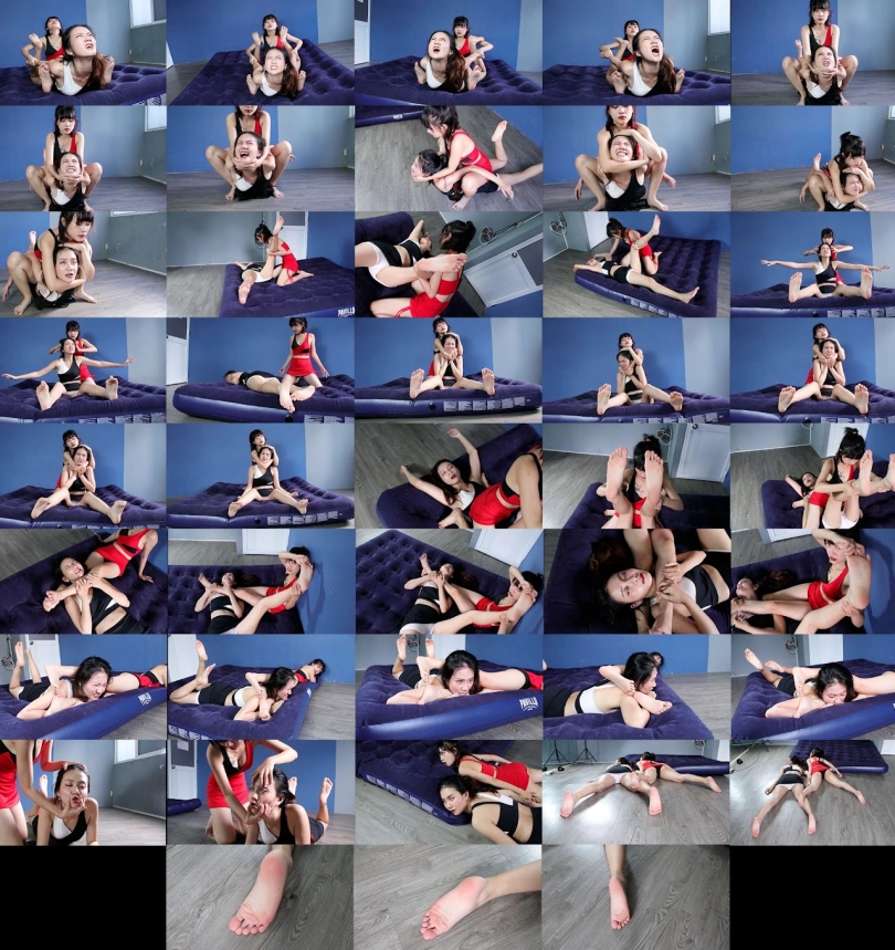 Emily (Red) Dominated Nana (White) with various wrestling moves. Nana is knocked out multiple times. Bonus foot fetish content at the end!