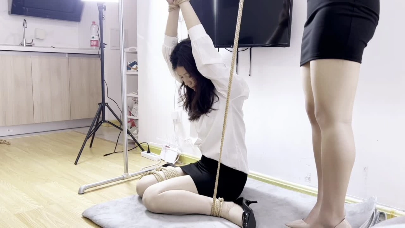 双手吊起折腿缚坐在地上塞上口球被人疯狂蹂躏袭胸,最后受不了恳求放过无助求饶。