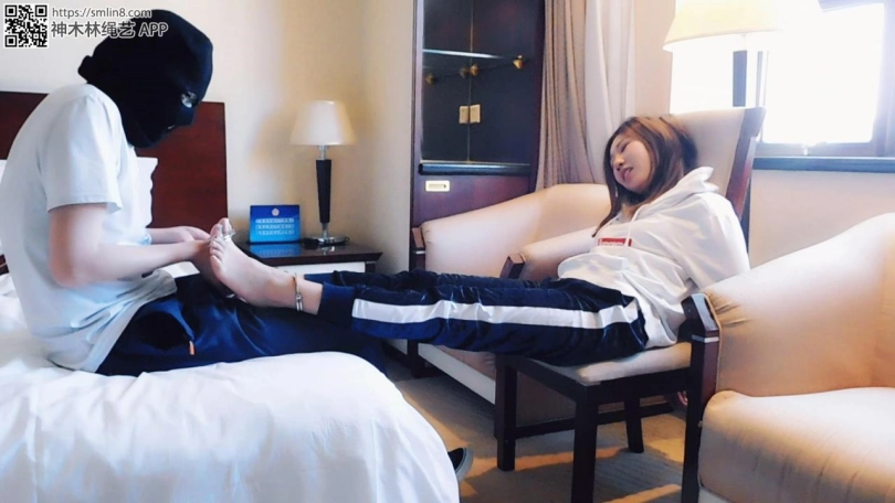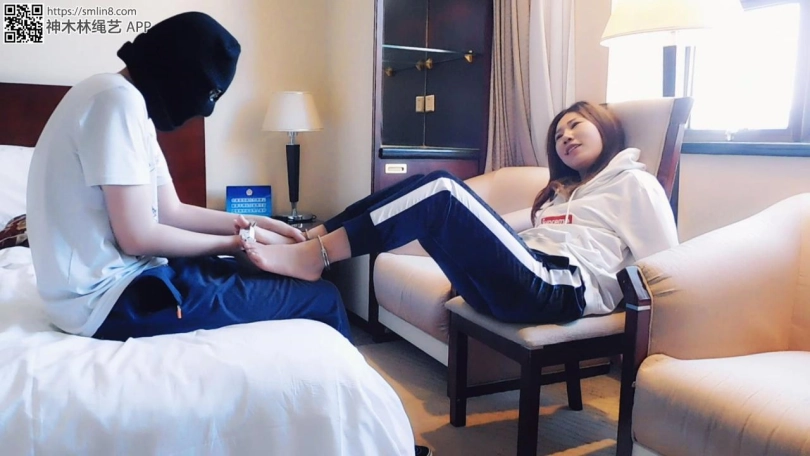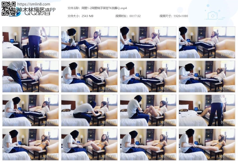 妹子在等朋友回来,但是却进来一个坏人,把她弄到椅子上,手背后锁住,脱下鞋,戴上脚铐,穿着白船袜锁脚趾铐,挠脚心。挠了一会,解开脚趾铐,脱下袜子,再锁上2个脚趾铐,继续挠。又挠了一会,解开镣铐,脱下衣服,只剩内衣,再全部锁上,继续挠。