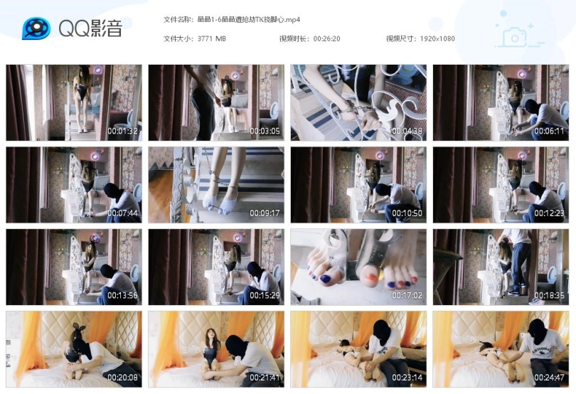 【视频时长】:00:26:19 【文件大小】:3771M 关键词:晶晶 遭抢劫 TK挠脚心 手铐 脚铐脚 趾铐 兔子服 帆布鞋 棉袜 TK挠脚心 晶晶在家坐,祸从天上来!!!变态抢劫犯入室抢劫,为了逼问密码,拔掉了女主人的鞋袜,连脚趾都给铐上了,强力挠脚心,这下可是真的难受了哈哈哈!!! 妹子在等朋友回来,劫匪却偷偷闯入,把她弄到台阶上,手锁在栏杆里,脚镣拴住一只脚,戴上脚铐,脱下鞋,戴上脚趾铐,挠脚心。挠了一会,解开脚趾铐,脱下袜子,再锁上,并把脚趾和脚腕连起来,继续挠。又挠了一会,劫匪把妹子抱起来,躺在床上,继续挠脚心。劫匪把妹子弄趴下,继续挠脚心,直到妹子说出密码,劫匪扔下妹子离去。 ![]() ![]() ![]() ![]() ![]() ![]() ![]() ![]() ![]() ![]() ![]()