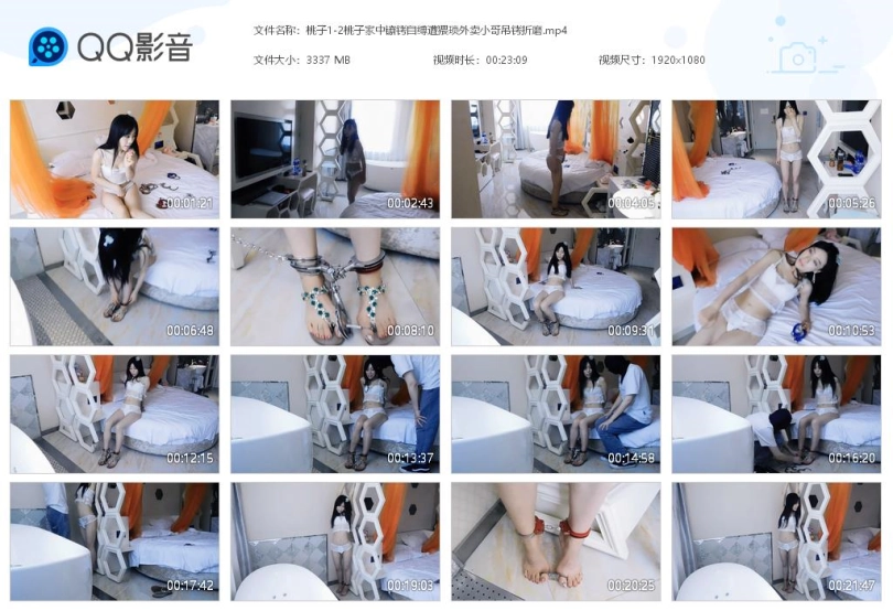 关键词:桃子 家中 镣铐 自缚 遭猥琐外卖小哥 吊铐折磨 手铐 脚铐 脚趾铐 蕾丝内衣 凉鞋