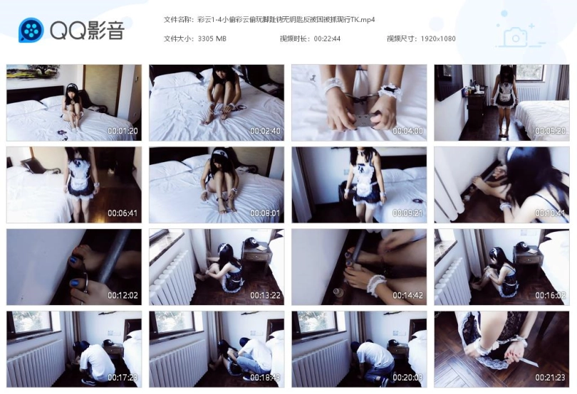 【视频时长】:00:22:43 【文件大小】:3305M 关键词:小偷彩云偷玩脚趾铐 无钥匙反被困 被抓现行 TK 手铐 脚铐 脚趾铐 女佣装 帆布鞋 棉袜 妹子是个小偷,偷偷进入事主家,脱下鞋子,穿着袜子各地翻找偷东西。当妹子偷的差不多之后,翻到一个脚趾铐、一个脚铐和两把钥匙,妹子十分好奇,想了想,认为是锁脚上的,然后就锁在了脚上。妹子觉得太好玩了,玩了一会下地走了走,然后用钥匙又解开了,于是拿着脚趾铐、脚铐和钥匙(但钥匙却意外掉落了),去另一个地方。妹子盗窃成功,十分开心,并且十分嚣张,想继续玩耍脚趾铐。妹子找到一个柱子,脚趾穿过去,锁上了脚趾铐,再锁上脚铐,玩了一会。当妹子玩够了,想拿出钥匙打开时,发现钥匙不见了,回忆了一下,钥匙掉了,这下妹子可着急了,脚趾被困住拔不出来,等下事主回来肯定就被抓现行啊,妹子十分着急。妹子各种努力拔脚趾铐,却无济于事,十分后悔,想着事主来了一定被抓十分难过。失主回来了,看到眼前的一切,又见到被困住的妹子。妹子坦白了,希望事主能放过她。然而事主很生气,于是决定惩罚她。事主拿出脚镣拴着妹子的脚,双手背铐,惩罚小偷。妹子挣扎求饶,但最终失主还是决定将小偷送到警局,妹子哭了出来。 妹子第一次尝试啦!!!处女作!!! ![]() ![]() ![]() ![]() ![]() ![]() ![]() ![]() ![]() ![]() ![]() ![]() ![]() ![]() ![]() ![]()