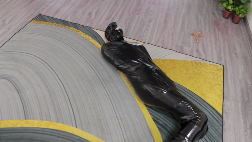 女侦探假扮成空姐不等好友到来,急于进入绑匪老巢,发现后被双手捆绑在两边,双腿交叉捆绑,逃跑不成最后被绑匪塞入乳胶全包袋子挣扎。